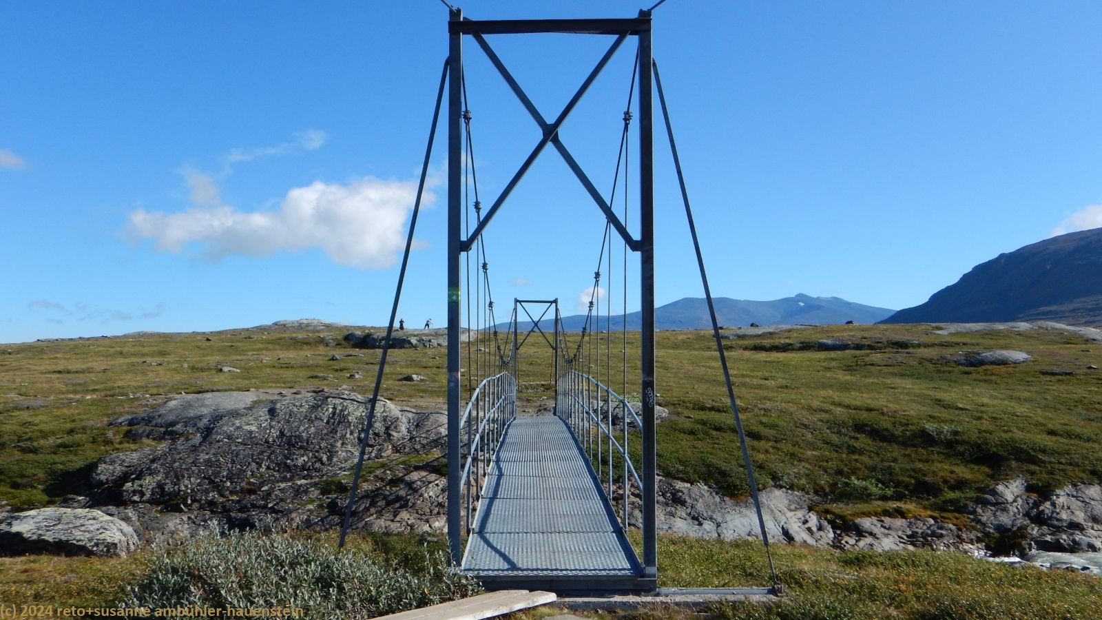 35 minuten später brechen wir wieder auf und passieren den checkpoint. hier können sich die teilnehmenden verpflegen und wohl auch pflegen lassen. unmittelbar nach dem checkpoint müssen wir den breiten zufluss sielmmánjira des aliseatnu durchqueren. ein crew member des fjällräven classic zeigt uns, wo der fluss am besten zu durchqueren ist. es gelingt uns, trockenen fusses ans andere ufer zu kommen, das war ein guter tipp. nun sind es noch zwei kilometer bis zum tagesziel. längst sehen wir die stuga auf der anderen seite des tals. der ceavccanjira hat eine tiefe schlucht ins gelände geschnitten. eine hängebrücke überspannt die schlucht. sie befindet sich etwas südlich der stuga, wir gehen deshalb an letzterer vorbei. auf der anderen talseite geht es dann einige hundert meter nordwärts zurück zur stuga. wir erreichen diese gegen 14 uhr.