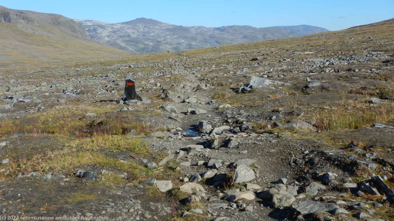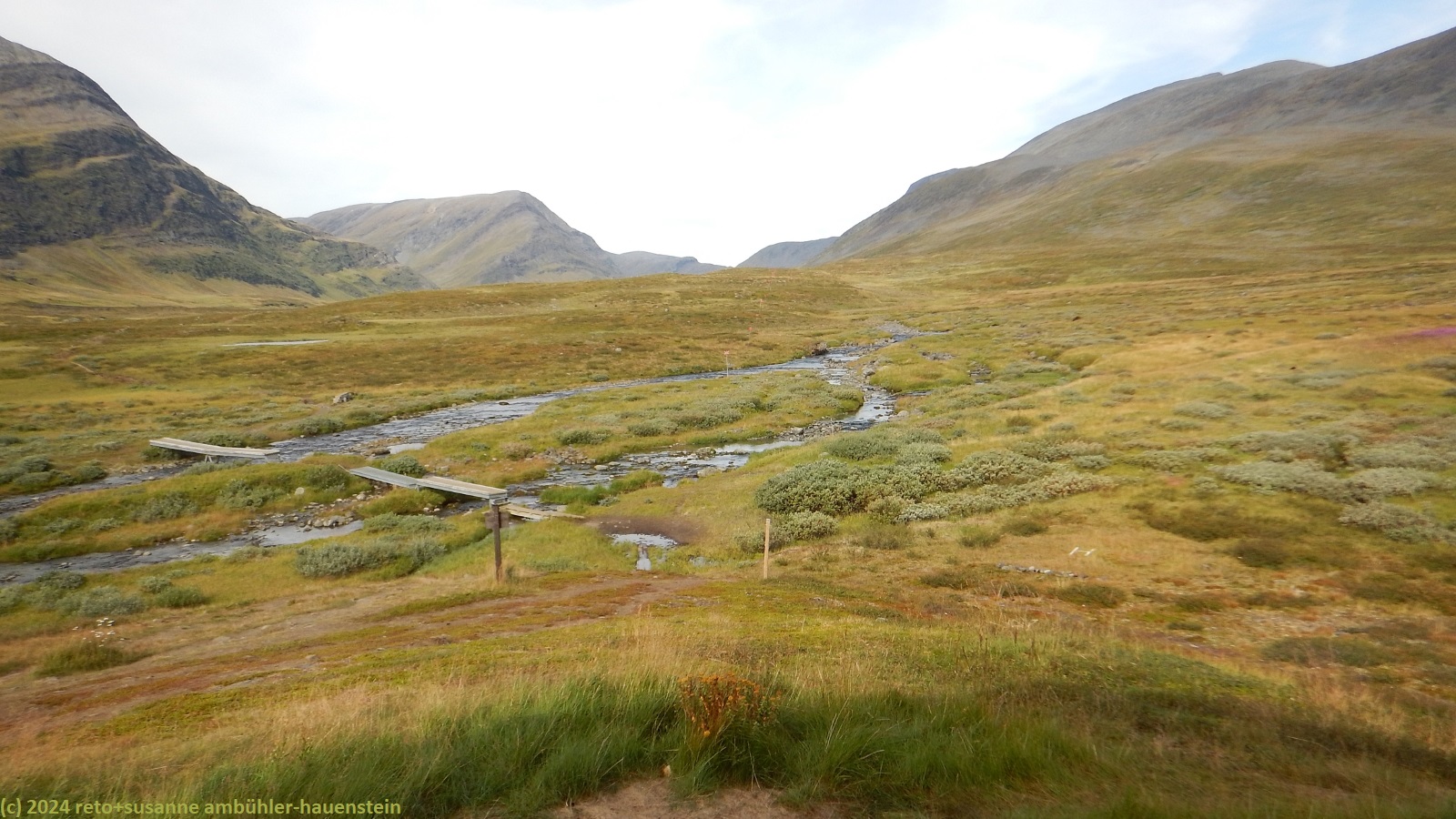 die nacht ist sehr ruhig. wir schlafen bis um 5 uhr der wecker unseres zimmergenossen los geht. er stellt ihn zwar rasch ab, aber wach sind wir trotzdem. er bleibt dennoch bis 7 uhr liegen. um 07:30 uhr stehen wir auf und frühstücken in der küche. es herrscht reger betrieb aber es geht sehr gesittet zu und her. der himmel ist fast wolkenlos, die sonne scheint herrlich. es geht jedoch immer noch ein kräftiger südwind. kurz nach 9 uhr brechen wir auf. wie im tagebuch von gestern bereits erwähnt, sind wir die vor uns liegende strecke schon einmal gelaufen, aber ohne den zwischenhalt in der tjäktjastuga, siehe tagebuch vom 07-aug-2017. über die spektakuläre hängebrücke geht es zurück auf den kungsleden. dieser steigt nun weiter an richtung tjäktjapass. es gibt einige einfache flussdurchquerungen. es kommen uns nun nur noch vereinzelte wanderer entgegen, niemand trägt die orange markierung der fjällräven classic. offenbar haben wir die teilnehmenden nun alle hinter uns. während wir den pass erklimmen, geniessen wir die wiedergewonnene ruhe. der blick zurück ins tal ist atemberaubend, ganz besonders bei diesem herrlichen wetter. nach etwa einer stunde erreichen wir die passhöhe. mit 1140 m.ü.m. befinden wir uns nun auf dem höchsten punkt des nördlichen kungsleden.