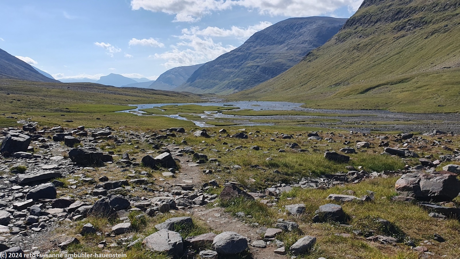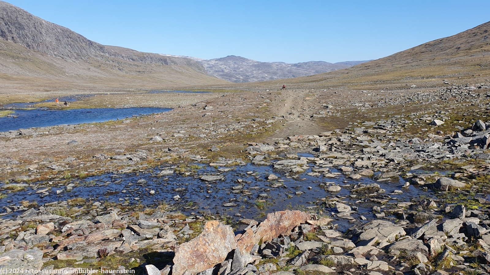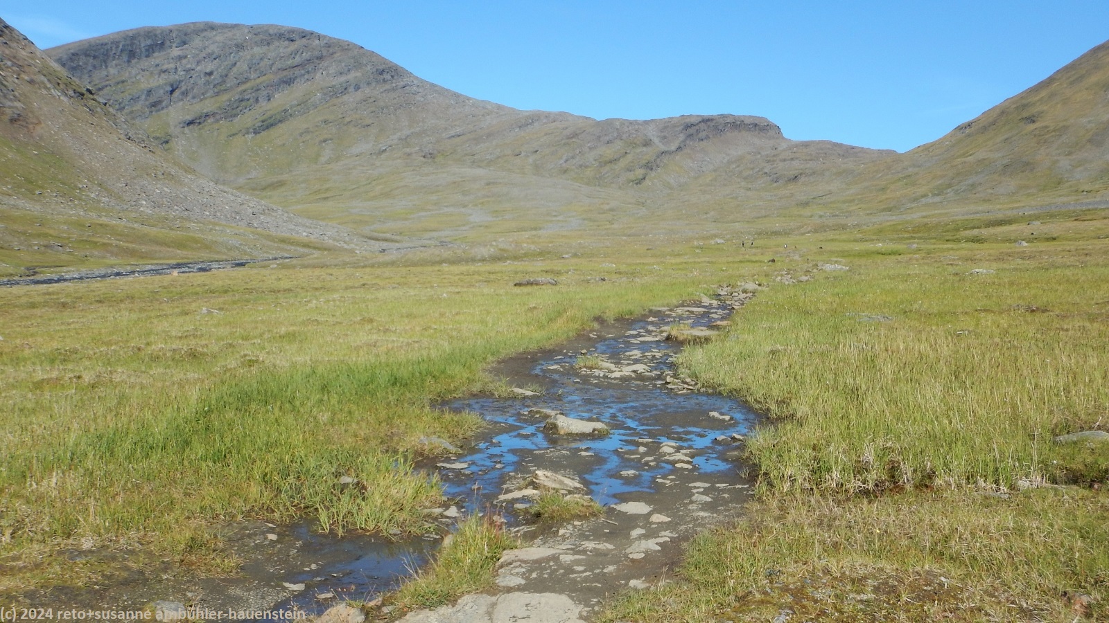 es geht ein stürmischer wind. nach einem kurzen halt nehmen wir den abstieg ins tal des tjäktajåkka in angriff. zu beginn ist der pfad recht steil und windet sich kurvenreich bergab. danach wird das gelände zwar flacher, der weg aber umso holpriger. ausgedehnte felsenfelder machen das vorwärtskommen ziemlich mühsam. die stege dazwischen sind eine willkommene abwechslung und grosse erleichterung. als wir einen etwas breiteren zufluss zum tjäktajåkka erreichen, haben wir ziemlich genau den halben weg hinter uns. mitten im flussbett setzen wir uns auf einen grossen stein und machen kurz pause. wir trinken einen schluck und essen einen stengel. knapp zehn minuten später brechen wir wieder auf. die teilnehmenden der fjällräven classic haben wir definitiv hinter uns. in beiden richtungen sind die gewohnten wanderer unterwegs. im gegensatz zum eher felsigen tal nördlich des tjäktjapasses ist das südliche tal üppig bewachsen und sehr grün. wir sehen einige einzelne rentiere. schnee hat es dieses jahr fast gar keinen. gegen 13 uhr erreichen wir die sälkastugorna. wir werden freundliche empfangen.
