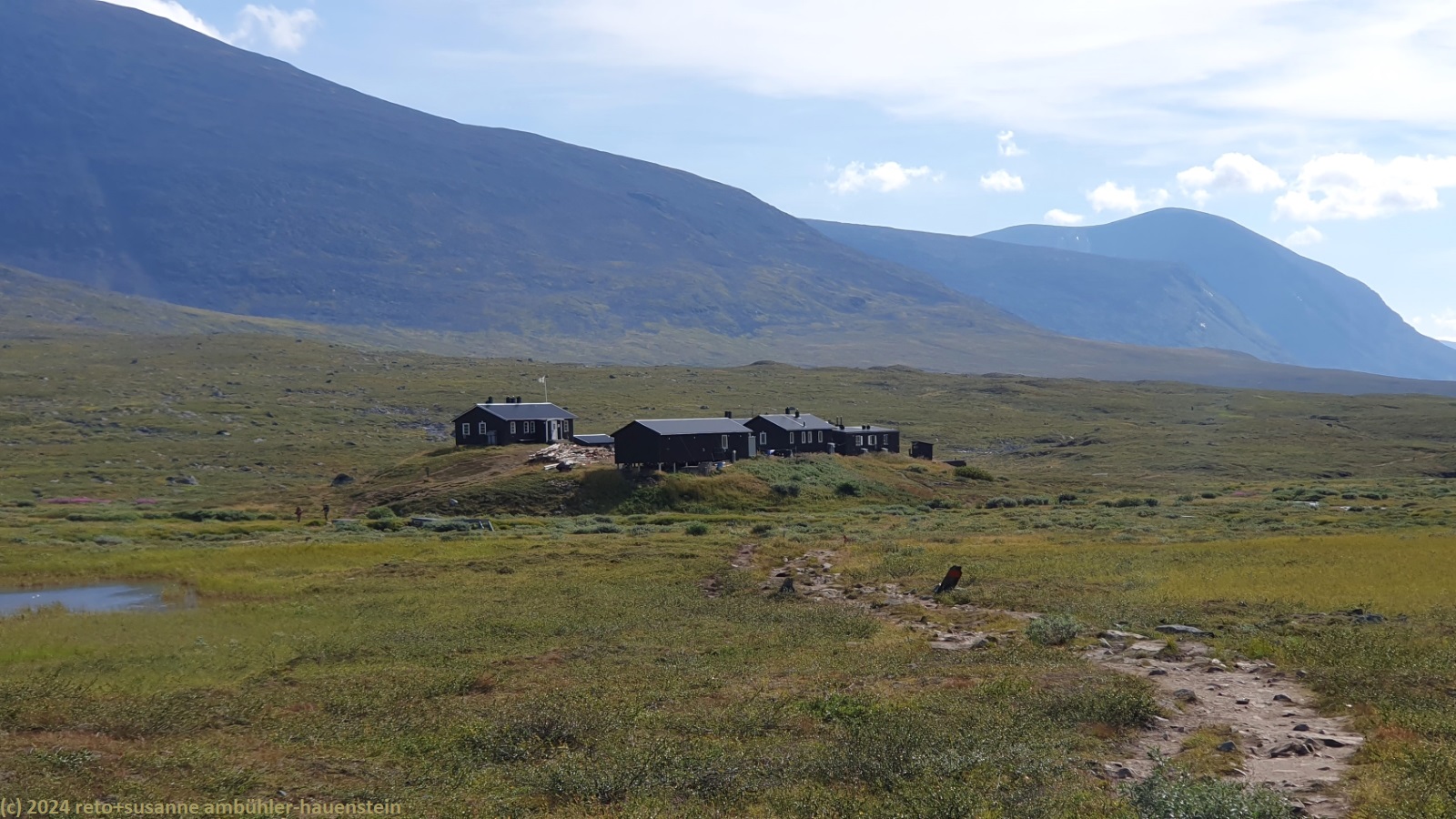 die nachtruhe wird um 5 uhr kurz vom wecker unseres zimmergenossen unterbrochen, ansonsten schlafen wir sehr gut. wir stehen um 07:30 uhr auf. der himmel ist annähernd wolkenlos, der südwind bläst aber immer noch. kurz nach 9 uhr brechen wir auf. bei herrlichem wetter überqueren wir die hängebrücke zurück zum kungsleden und nehmen anschliessend den aufstieg zum tjäktjapass in angriff. dieser ist mit 1140 m.ü.m. der höchste punkt des nördlichen kungsleden. wir begegnen zwar gelegentlich menschen, aber teilnehmende der fjällräven classic sind keine mehr dabei. auf der passhöhe machen wir kurz rast und geniessen sowohl den blick richtung norden ins tal des tjäuftjanjira als auch richtung süden ins tal des tjäktjatjåkka. der abstieg ist anfangs ziemlich steil, flacht aber bald ab. gegen 13 uhr erreichen wir unser tagesziel sälkastugorna. wir picknicken an einem tisch im freien. den nachmittag verbringen wir im und ums haus. nach dem nachtessen besuchen wir die sauna. anschliessend sitzen wir draussen, bis plötzlich lästige mücken auftauchen und wir im aufenthaltsraum zuflucht finden. die nacht verbringen wir zusammen mit vier tschechen in einem 6-bett-zimmer.