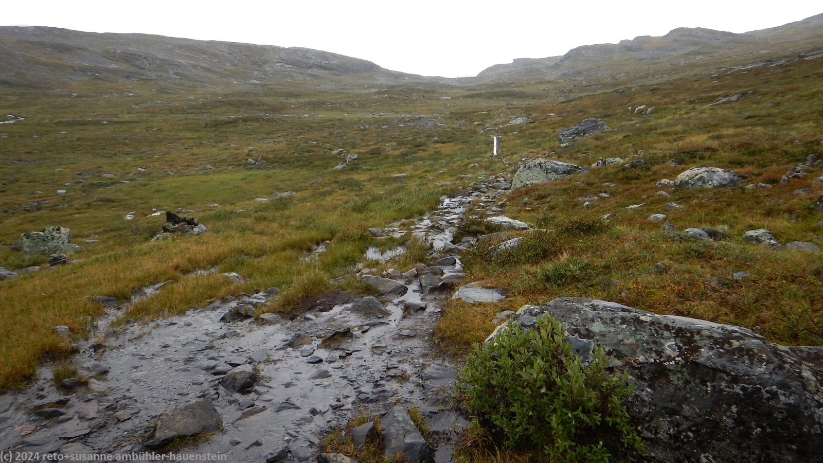 da heute vorallem für den vormittag starker regen angesagt ist, verzichten wir darauf, einen wecker zu stellen. die nacht ist sehr ruhig, wir schlafen bestens. um 07:45 uhr stehen wir auf. das deutsche pärchen ist bereits in der küche. wir bereiten ebenfalls unser frühstück zu. draussen bläst ein stürmischer wind und es regnet. in der nacht war es noch trocken, aber nun entleeren sich die grauen, tiefliegenden wolken. gegen 09:10 uhr sind wir startbereit. wir haben regenhosen und regenjacken angezogen und auch an den rucksäcken die regenschütze montiert. heute folgen wir nicht mehr dem kungsleden, sondern wir wandern auf dem "dag hammarskjöldsleden" westwärts richtung nikkaluokta. genau genommen waren wir schon die ganze zeit auf diesem als "moderner pilgerweg" bezeichneten pfad unterwegs, denn dieser führt von abisko nach nikkaluokta, dies ist exakt unsere route. entlag des "dag hammarskjöldsleden" hat es sieben sogenannte "meditationsplätze" wo menschen ihre "innere ruhe" finden können. der pilgerweg hat einen religösen hintergrund, siehe website der schwedischen kirche. unser heutiges ziel ist die kebnekaise fjällstation. von dieser strecke sind wir nur die letzten kilometer schon einmal gewandert, als wir von der kebnekaise fjällstation aus einen tagesausflug zum silverfallet gemacht hatten, siehe tagebuch vom 24-jul-2013. der weg steigt sofort an. vor uns liegen 150 höhenmeter bis zum lássajávri. es regnet und es bläst immer noch dieser kräftige wind. eigentlich hatte ich erwartet, dass wir heute rücken- oder zumindest seitenwind hätten, aber der wind bläst uns direkt ins gesicht. während dem aufstieg intensiviert sich der regen. erst als wir die passhöhe erreicht haben, lässt er etwas nach. wir wandern nun ins hübsche tal des láddjujohka. anfangs hat es einige seelein, dann geht es dem fluss entlang. eher überraschend macht der regen etwas pause. wir nutzen die gelegenheit, setzen uns auf einen grossen stein am wegrand und essen einen stengel. kaum brechen wir wieder auf, beginnt der regen erneut und nun ziemlich heftig. der pfad ist entsprechend matschig mit vielen pfützen. manche steine sind sehr rutschig, so dass man stets auf der hut sein muss. wir überstehen die holprige wanderung schadlos. gegen 12:15 uhr halten wir ausschau nach einer gelegenheit um zu mittag zu essen. schutzhütten gibt es an dieser strecke leider keine. susanne entdeckt etwas abseits des weges einen mächtigen felsen, der dank seiner schrägen form etwas schutz vor dem regen bietet. wir setzen uns unter den vorsprung und essen unsere sandwiches.