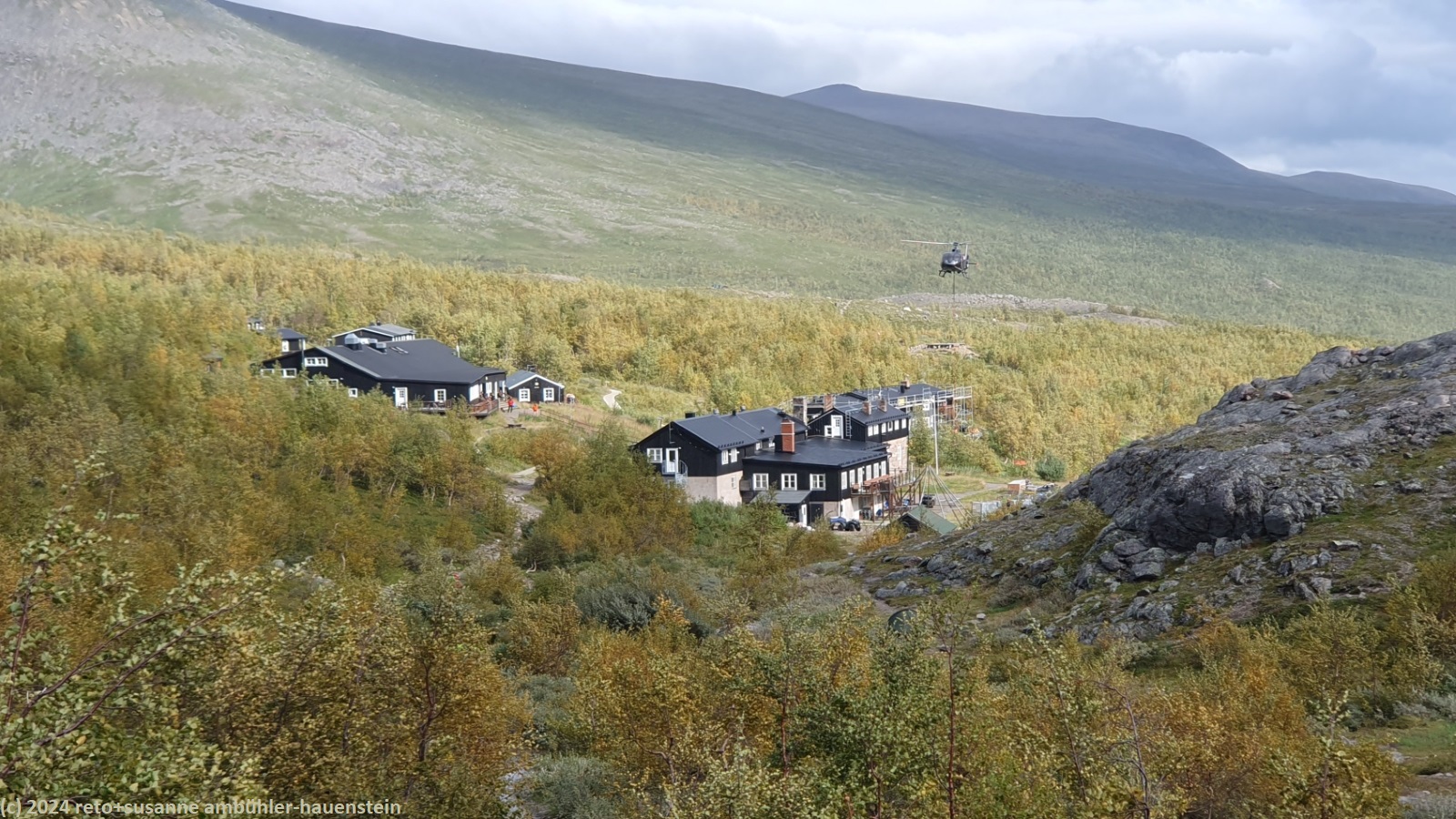 da ein nasser vormittag zu erwarten ist, schlafen wir bis 07:45 uhr. als wir um 09:10 uhr aufbrechen herrscht übles regenwetter. wir folgen nun nicht mehr dem kungsleden, sondern dem als "moderner pilgerweg" bezeichneten "dag hammarskjöldsleden". auf den ersten knapp 3 km überwinden wir 150 höhenmeter. nach der passhöhe wandern wir durch das tal des láddjujohka. als der regen kurz pause macht, setzen wir uns auf einen grossen stein am wegrand und essen einen stengel. der regen hat den pfad in einen schlammigen und pfützenreichen matsch verwandelt. gegen 12:15 uhr finden wir unter einem schrägen felsen etwas schutz und essen unsere brote. als wir wieder aufbrechen schüttet es immer noch. wir kämpfen uns durch sumpf und schlamm. inzwischen sind wir völlig durchnässt. eher überraschend gibt es auf den letzten kilometern doch noch ein paar sonnenstrahlen. kurz nach 14:30 uhr erreichen wir unser tagesziel. die kebnekaise fjällstation ist gemäss aussage der dame am empfang völlig ausgebucht. wir teilen unser 4-bett-zimmer mit einem jungen pärchen. nach einer erfrischenden dusche verbringen wir den nachmittag im gut besuchten aufenthaltsraum des hauptgebäudes. für das nachtessen dürfen wir uns im restaurant ans fenster setzen, das ist toll. um 19 uhr besuchen wir die sauna, den abend verbringen wir im aufenthaltsraum.
