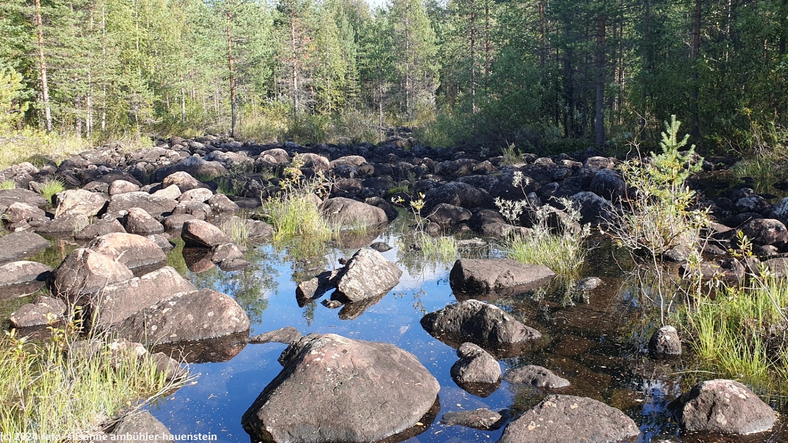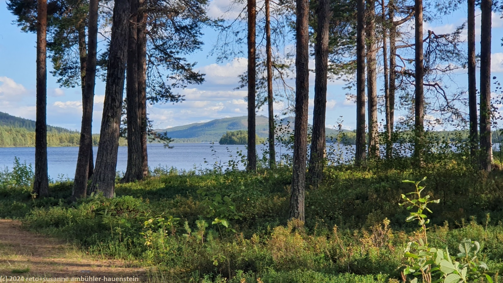 als wir fertig gepackt haben, unternehmen wir einen spaziergang. wir folgen erst dem ufer des lilla luleälven. der pfad ist nicht ganz einfach zu erkennen, führt uns aber durch einen schönen wald. er endet an einem zufluss zum lilla luleälven. wir schaffen es trockenen fusses über die grossen steine im wasser auf die andere seite, aber dort hat es keinen weg. da wir in der nähe ein haus sehen, schlagen wir uns durch den wald bis zur kleinen siedlung. ab hier geht es auf einer unbefestigten strasse bis zur hauptstrasse. dieser folgen wir bis zum nahen reitstall. wir überqueren die hauptstrasse und finden in der zufahrtsstrasse den einstieg zum wanderweg zurück zum campingplatz. wieder führt der pfad durch einen schönen wald. noch einmal müssen wir über die hauptstrasse, dann sind wir wieder beim campingplatz.