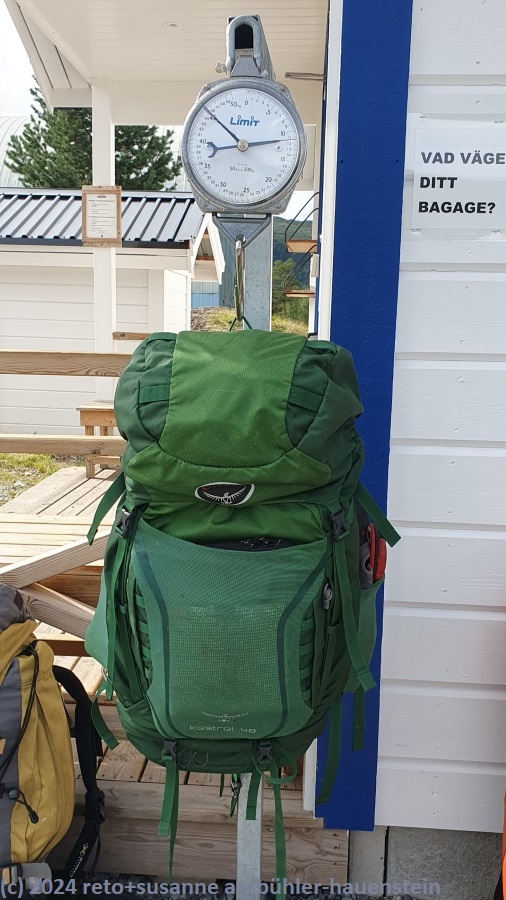 wir stoppen beim heliport und vergewissern uns, dass unsere buchung geklappt hat. der freundliche herr am schalter bestätigt dies. da wir noch eine stunde zeit haben, bis wir hier sein müssen, fahren wir zur fjällstation. unsere sandwiches müssen wir draussen essen, kaffee und kuchen geniessen wir dann im restaurant. um 12:20 uhr sind wir wieder beim heliport. wir schliessen an unserem jogi die vorhänge und ziehen unsere wandersachen an. danach wägen wir unsere rucksäcke. susannes rucksack wiegt 10.4 kg, meiner ist mit 11.4 kg ebenfalls etwas leichter als bei der letzten mehrtageswanderung auf dem nördlichen kungsleden, siehe tagebuch vom 11-aug-2024.