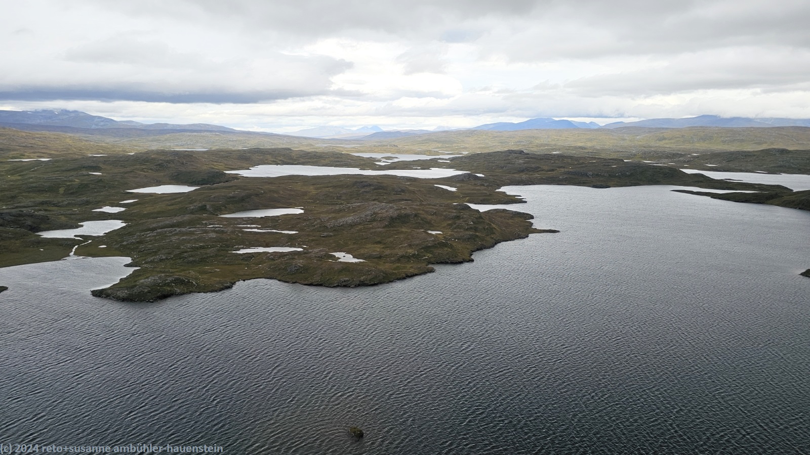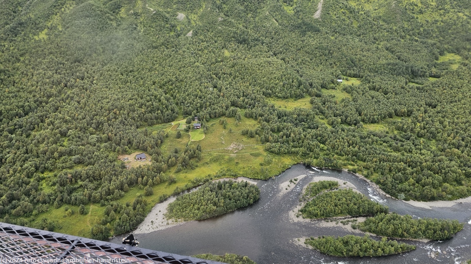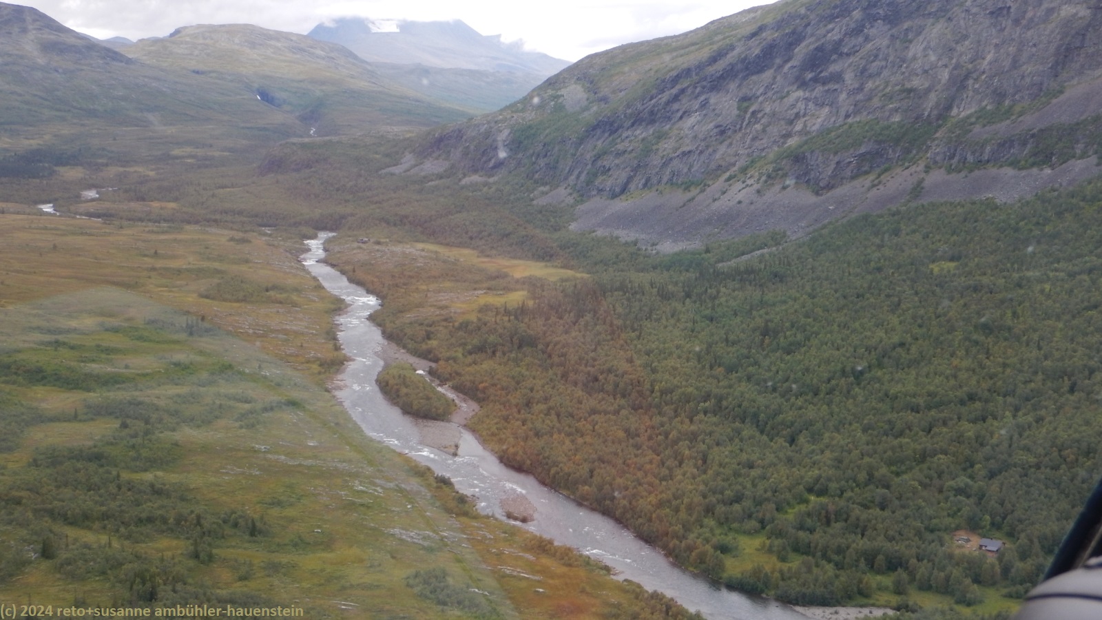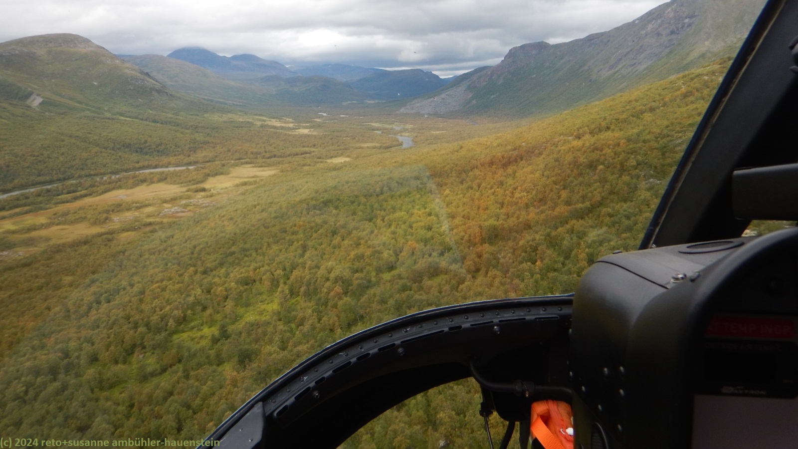 zehn minuten vor dem geplanten start fragt der pilot, ob wir bereit seien. wir bejahen und auch der belgier mit seinen zwei kindern, die mit uns zusammen fliegen werden, sind startklar. der pilot verstaut die fünf rucksäcke im heli, dann dürfen wir einsteigen. der belgische vater möchte mit seinen kindern hinten sitzen, susanne ebenfalls. so nehme ich mit vergnügen neben dem piloten platz. der heli hebt sanft ab und schon geht es im tiefflug übers fjäll. es ist auch heute ziemlich windig, aber der pilot hat sein fluggerät fest im griff. gelegentlich dringen ein paar sonnenstrahlen durch die wolkendecke. wir überfliegen die beiden fjällstugas njunjes und såmmerlappa. die anderen beiden stugas lassen wir rechts liegen. nach knapp 25 minuten flug erreichen wir unser ziel staloluokta.