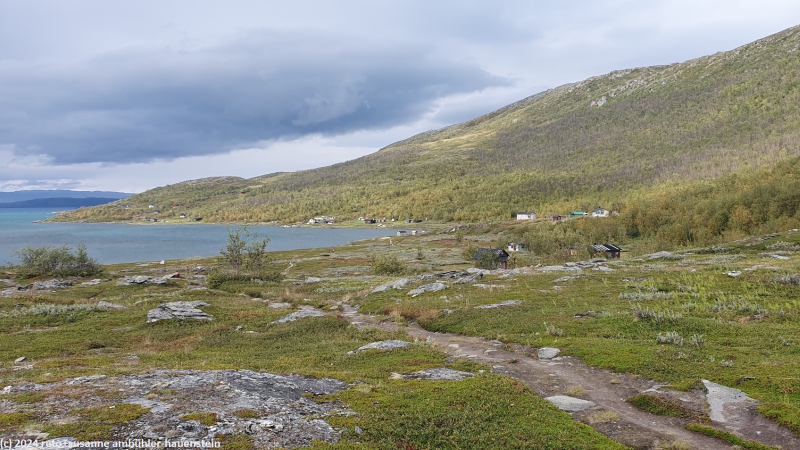 ich stelle fest, dass die email an den camping årrenjarka von meinem handy nicht versandt wurde, das ist ungeschickt, denn nun haben wir für den rest der woche kein empfang. via inReach bitte ich unsere tochter, die reservation zu tätigen, hoffentlich klappt das. draussen geht immer noch der böige wind. trotzdem gehen wir um die bucht herum zu dem haus, bei welchem man fladenbrot und geräucherten fisch kaufen kann. wir sind allerdings nur an ersterem interessiert. wir deponieren das fladenbrot in unserem zimmer, danach machen wir einen kleinen fussmarsch um den zeltplatz.