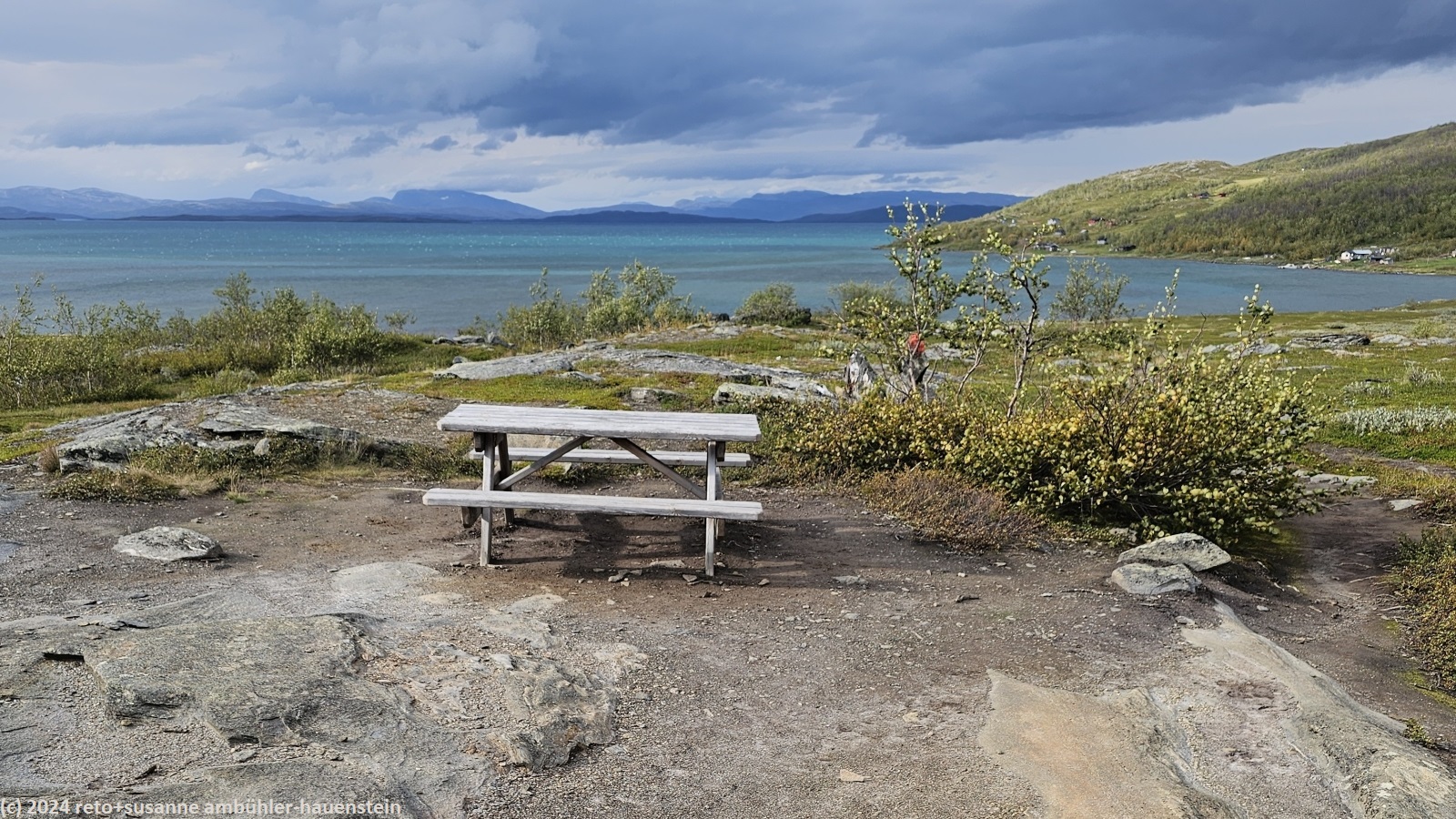wir schultern unsere rucksäcke und sind wenig später in der fjällstuga. der empfang öffnet zwar erst um 16 uhr, aber susanne begegnet der dame, welche hier schon letztes jahr das sagen hatte, siehe tagebücher vom 27-aug-2023, 28-aug-2023 sowie 29-aug-2023, und diese gestattet uns, das 2-bett-zimmer zu belegen. hier gibt es sechs 4-bett-zimmer und drei 2-bett-zimmer. zwei davon sind VIP-zimmer und haben eine eigene küche. wir dürfen im dritten 2-bett-zimmer übernachten. dieses hat zwar keine eigene küche, aber das brauchen wir auch nicht unbedingt. wir richten uns ein, danach geniessen wir im aufenthaltsraum kaffee bzw. tee und unsere zimtschnecken.