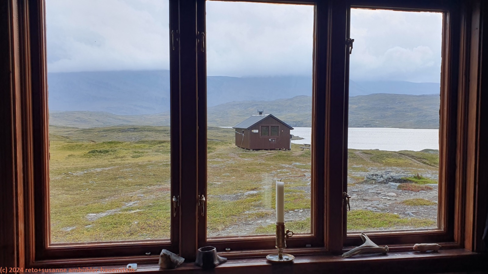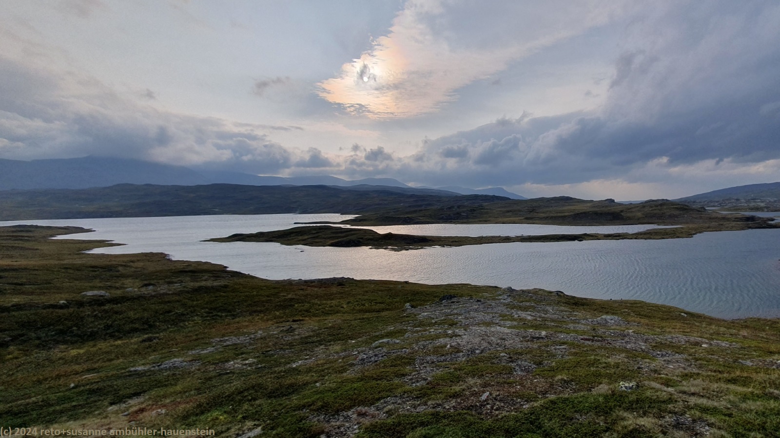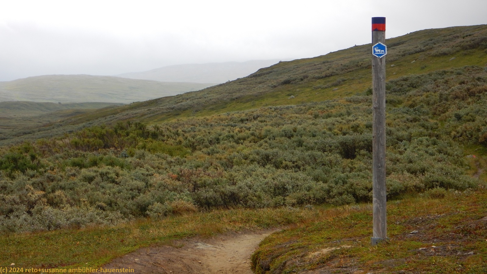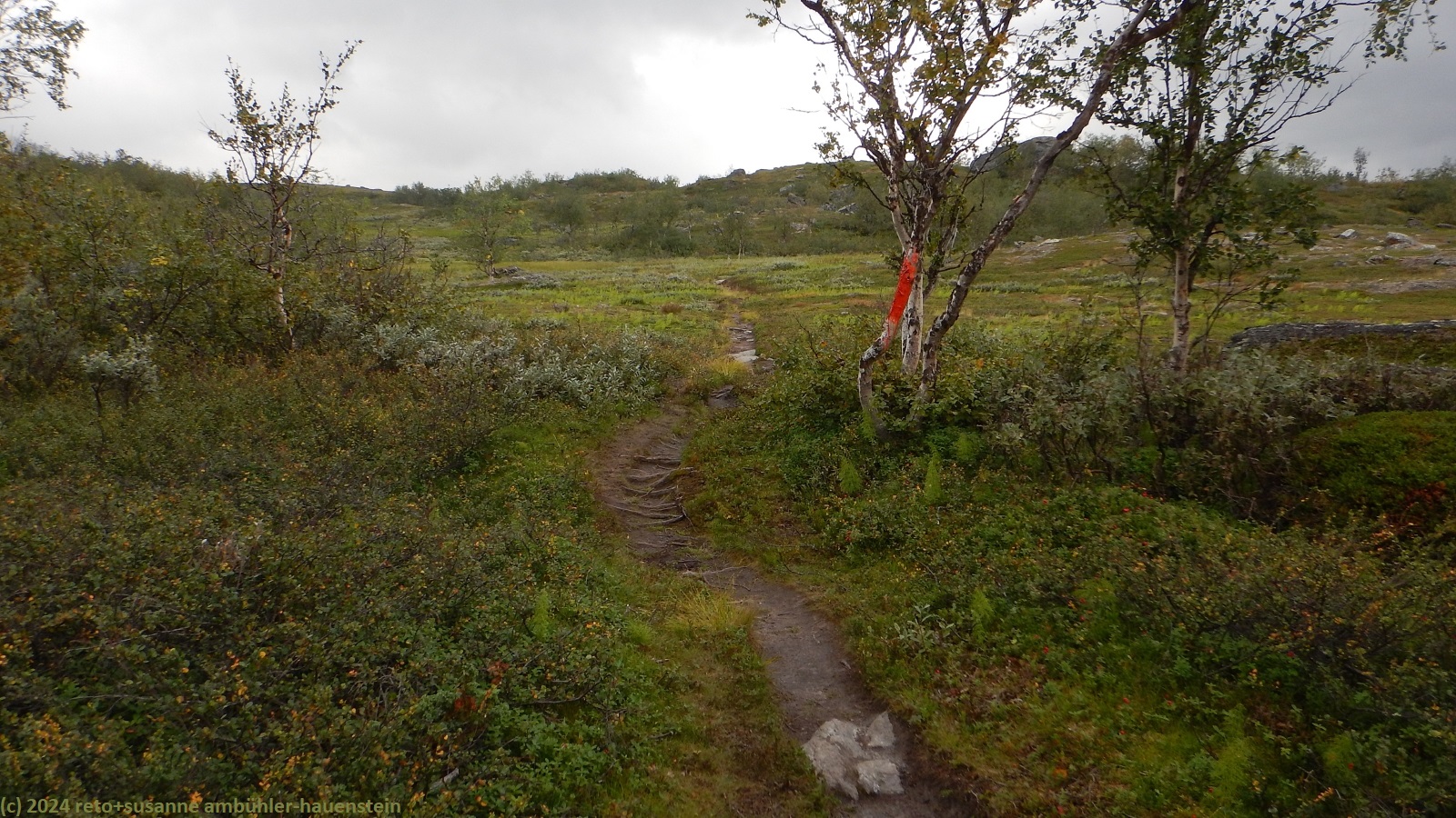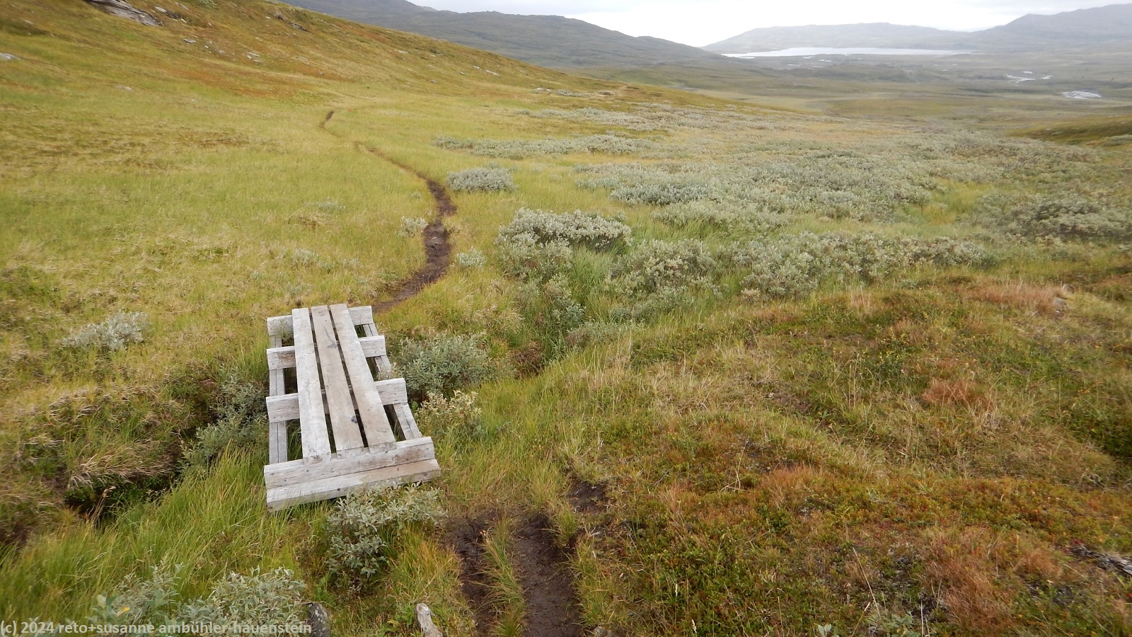 unser handy weckt uns um 7 uhr. die nacht war äusserst ruhig, ich habe sehr gut geschlafen. auch jetzt ist es im haus immer noch völlig still, offenbar sind noch alle gäste am schlafen. wir frühstücken im aufenthaltsraum mit blick auf den see. der himmel ist immer noch sehr verhangen und trüb, der wind bläst wie schon seit tagen. nach dem essen packen wir unsere rucksäcke, danach reinigen wir unser zimmer und den hintereingang. um 08:50 uhr brechen wir auf. wir überqueren die hängebrücke über den gieddejåhkå, danach steigt der weg sanft an. wenig später zweigt der nordkalottleden richtung süden ab. wir folgen dem padjelantaleden vorwiegend ostwärts. anfangs wandern wir durch niedrige birken, bei 630 m.ü.m. kommen wir über die baumgrenze. das kahle fjäll ist sehr grün, dazwischen sehen wir gelbliche und rötliche sträucher. es fällt ein leichter nieselregen, der manchmal etwas intensiver wird, dazwischen aber auch längere pausen macht. susanne hat die regenjacke angezogen, ich laufe im langarm t-shirt. am gieddávrre vorbei geht es ins weite tal des rådoljåhkå. der pfad ist grundsätzlich einfach und bequem zu begehen. er führt abwechslungsweise über offenes gelände und niedrige büsche. manchmal ist der weg ziemlich tief und sehr schmal, so dass nicht beide füsse nebeneinander platz haben. der aufstieg wird immer wieder durch kleine senken unterbrochen, so dass der weg ein bisschen einer berg- und talbahn ähnelt. bei der brücke über den ballavrijåhkå machen wir eine kurze pause. der fluss stürzt über mehrere kleine wasserfälle talwärts und macht einen ziemlichen lärm. ich liebe dieses geräusch. nach zehn minuten brechen wir wieder auf. am gegenüberliegenden hang scheint die sonne. das blaue loch in der wolkendecke ist stets vor uns, aber die sonnenstrahlen erreichen uns nicht. der weg steigt weiter sanft aber kontinuierlich an. wir wandern durch eine weite hochebene. die krete der bergkette rechts von uns ist in den wolken. gelegentlich sehen wir rentiere. gegen mittag finden uns die sonnenstrahlen dann doch noch. um 12:25 uhr picknicken wir in der nähe des ieltijávrásj zwischen grossen steinen.