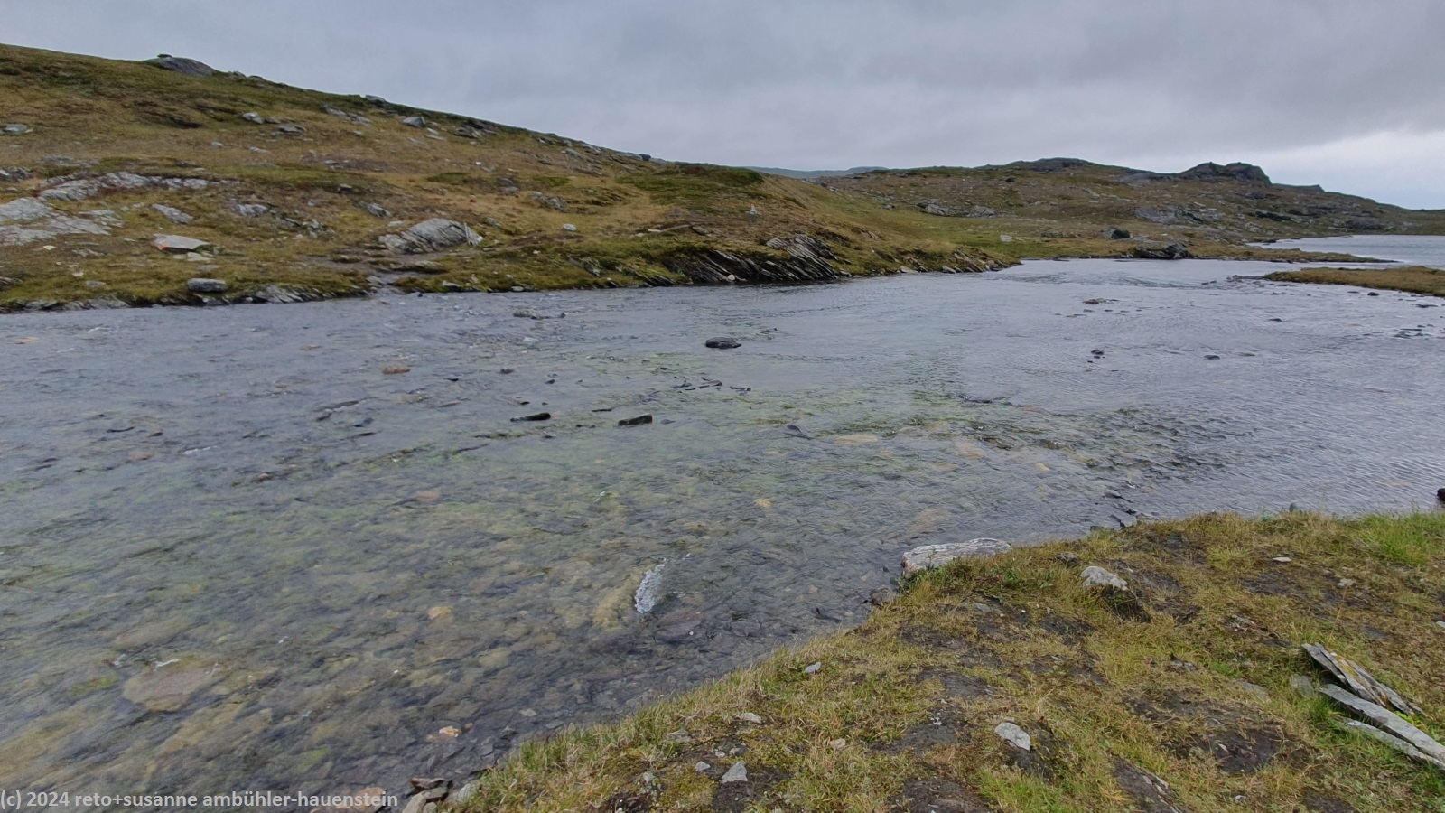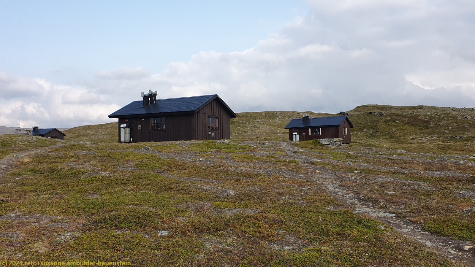 der wind bläst zwar immer noch, aber die sonne spendet ein wenig wärme. trotzdem ist uns nach 30 minuten ziemlich kalt und wir brechen wieder auf. die sonne verschwindet bald wieder hinter den dunkelgrauen wolken. am pfad und auch bei der landschaft ändert sich wenig. wir kommen sehr gut voran und erreichen um 14:20 uhr die erste furt vor den duottarstugorna. vor uns überqueren zwei wanderer den fluss in den wanderschuhen. susanne versucht es auch, meint aber schon nach den ersten eineinhalb metern, dass das nichts wird. wir ziehen daher die wanderschuhe aus und nehmen die wasserdichten socken hervor. in diesen lässt sich der fluss problemlos durchwaten. ich finde diese socken eine geniale erfindung. trotzdem fühlt es sich komisch an, in socken trockenen fusses durchs eiskalte wasser zu gehen. wir erreichen das andere ufer ohne probleme. da noch eine zweite furt folgt, wandern wir in den socken weiter. die zweite flussdurchquerung ist noch viel länger, es hat aber dazwischen kleine inseln. wir begegnen einer gruppe junger leute, die versuchen in den wanderschuhen den fluss zu bezwingen. auf halbem weg bemerken sie, dass das nicht klappt und nun stehen sie mit ihren schweren rucksäcken mitten im flussbett und kommen weder vor- noch rückwärts. wir erreichen das andere ufer wiederum trockenen fusses und nehmen den kurzen aufstieg zu den hütten in den socken in angriff. um 14:50 uhr sind wir am tagesziel. die hüttenwartin empfängt uns freundlich und weist uns eine der 6-bett-hütten zu.