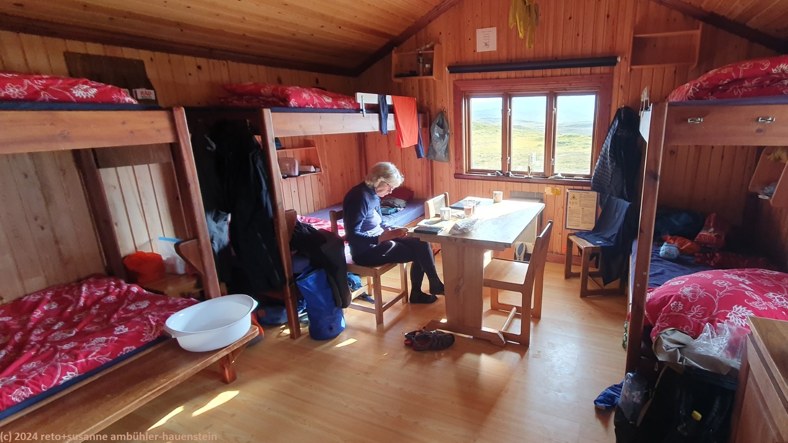 zurück in der hütte geniessen wir das abendessen. danach liest susanne, ich beschäftige mich am tablet. später koche ich mir noch heisses wasser für einen tee. der wind bläst unvermindert um die hütte. um 21 uhr stecken susanne und unser zimmergenosse bereits in den schlafsäcken und ich schlüpfe nun ebenfalls in meinen.