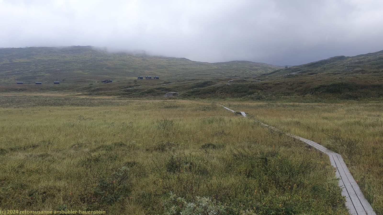 der hüttenwart empfängt uns freundlich und weist uns zwei betten im 4-bett-zimmer zu. wir werden letzteres mit einer schwedin teilen. wir richten uns in unserem zimmer ein, danach trinken wir einen kaffee. dazu gibt es etwas süsses aus dem kleinen laden des hüttenwartes. anschliessend waschen wir uns in unserem zimmer. den späteren nachmittag verbringen wir im aufenthaltsraum. der hüttenwart hat im ofen ein feuer entfacht, dieses verstrahlt eine angenehme wärme. die hütte füllt sich mehr, als der hüttenwart erwartet hat, weil vier holländer spontan entscheiden, hier zu übernachten. um 18 uhr geniessen wir unser nachtessen inklusive nachspeise. wir haben immer noch von den heidelbeeren, die susanne gestern gesammelt hat, damit ergänzen wir die vanilliesosse. das schmeckt sehr lecker. während wir essen, giesst es draussen in strömen. wie gewohnt dauert dieser zustand nicht lange. das wetter ist zwar grundsätzlich nach wie vor sehr trüb, trotzdem ist es auch wechselhaft, zumindest was wind und niederschlag betrifft. wir verbringen den abend, wie die meisten gäste, im aufenthaltsraum. erst liest susanne während ich mich am tablet beschäftige, danach spielen wir karten. gegen 21:30 uhr putzen wir unsere zähne und schlüpfen dann in unsere schlafsäcke.