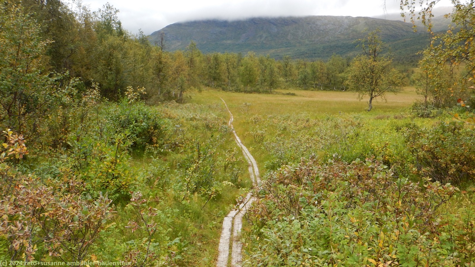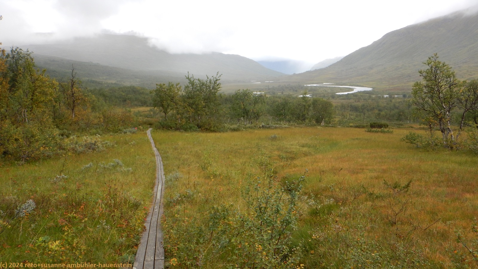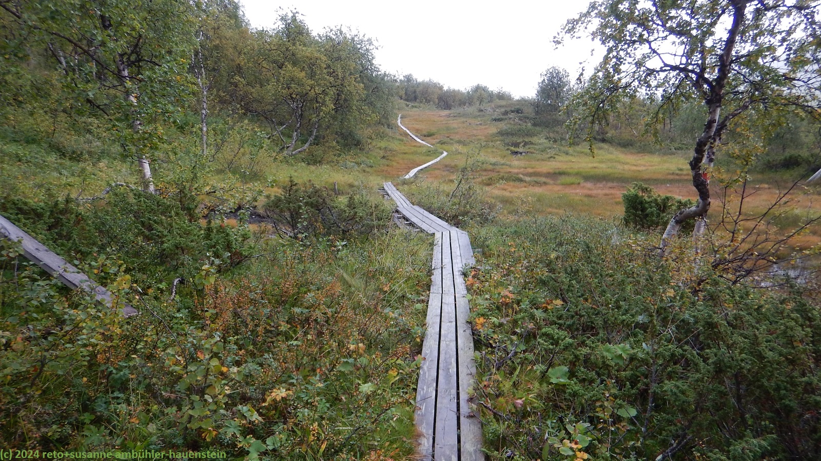 gegen 13:40 uhr brechen wir wieder auf. schon nach wenigen metern überspannt eine hängebrücke mitten im wald einen zufluss des tarrajåkkå. danach geht es wiederum abwechslungsweise durch birkenwald und sumpfgebiete. sowohl der reiseführer als auch der hüttenwart der darreluoppalstugorna warnten uns vor den rutschigen planken ausserhalb des nationalparkes. diese warnungen sind nicht übertrieben, die holzstege sind stellenweise in schlechtem zustand und extrem rutschig, besonders bei diesem nassen wetter. wir rutschen beide je einmal aus, aber ohne folgen. die letzten kilometer führen vorwiegend durch wilden birkenwald. die såmmarlappenstuga taucht erst zwischen den bäumen auf, als wir da sind.