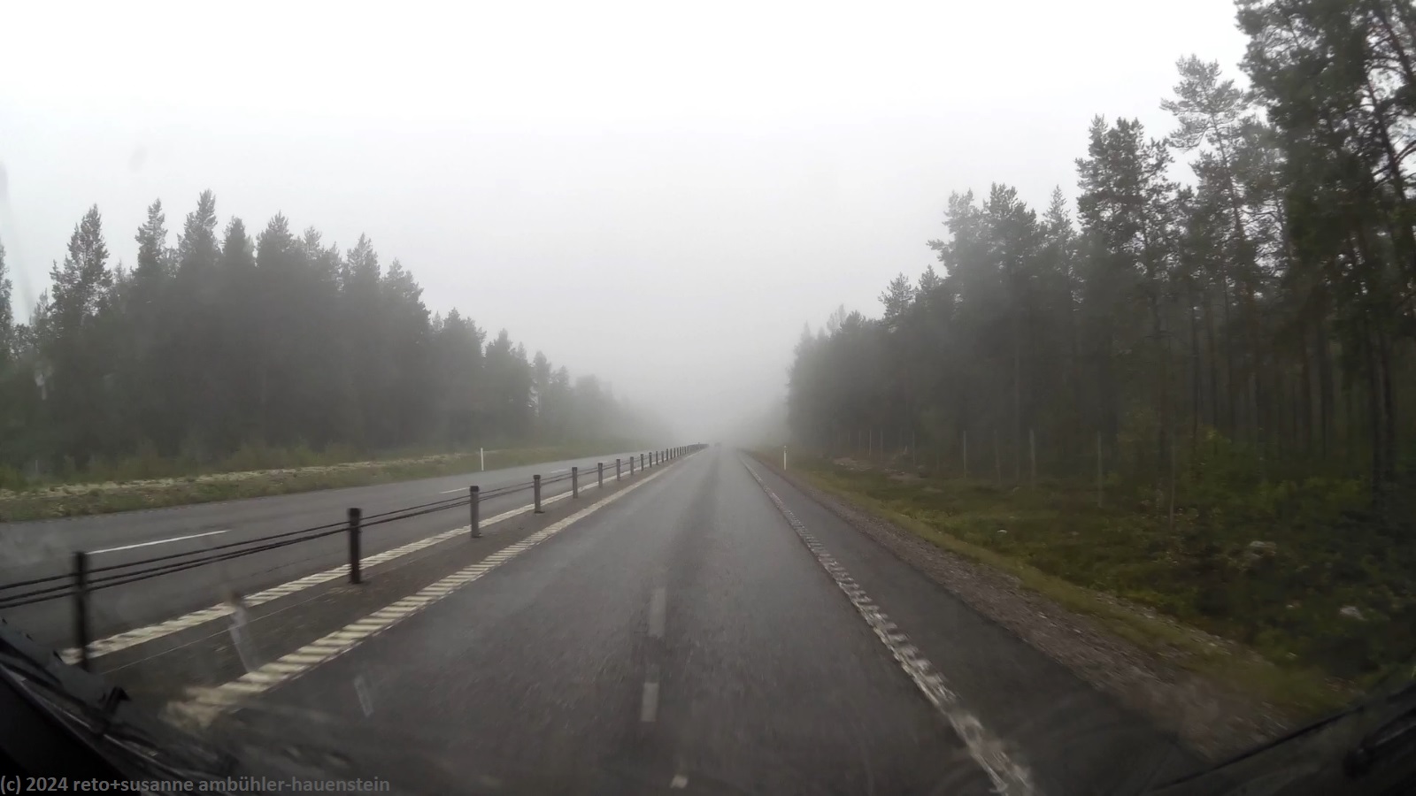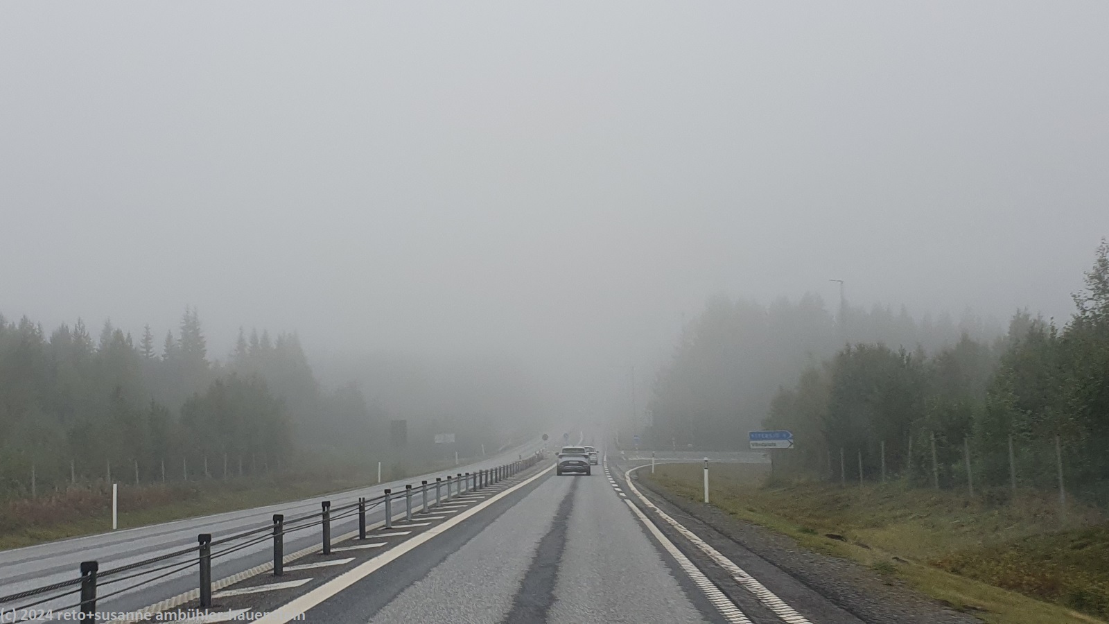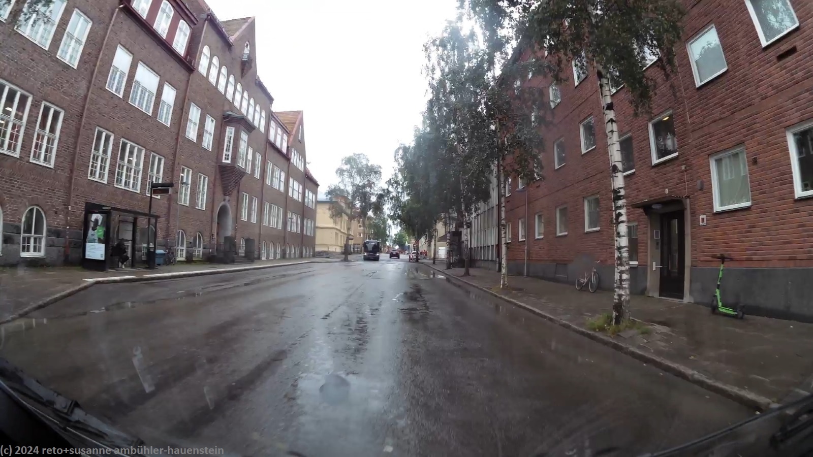 wir schlafen bis fast 9 uhr. als wir aufstehen, prasselt ein heftiger regen auf unseren jogi. wir brauchen einen schirm, um zur toilette zu gehen. nach dem frühstück im wagen machen wir uns bereit für die weiterfahrt. kurz vor 10:40 uhr verlassen wir den campingplatz. die fahrt über die E4 ist sehr entspannt, es hat viel weniger verkehr, als ich erwartet hätte. abschnittsweise ist die strasse dreispurig, manchmal hat es in unsere fahrtrichtung eine überholspur, dann in die entgegengesetzte richtung. gelegentlich gibt es einen lastwagen zu überholen, aber das verkehrsaufkommen ist äusserst gering. der regen lässt bald nach, dafür fahren wir nun durch dichten nebel. südlich von bureå werden die dreispurigen abschnitte vorübergehend seltener. südlich dieser stadt zeigt der kilometerzähler unseres wagens 368000. gegen 13:30 uhr erreichen wir umeå. susanne hat die adresse eine cafes ins navi programmiert, aber rund um die adresse sind nichts als baustellen. wir parkieren deshalb in einem nahen parkhaus und machen uns zu fuss auf die suche nach dem cafe rost.