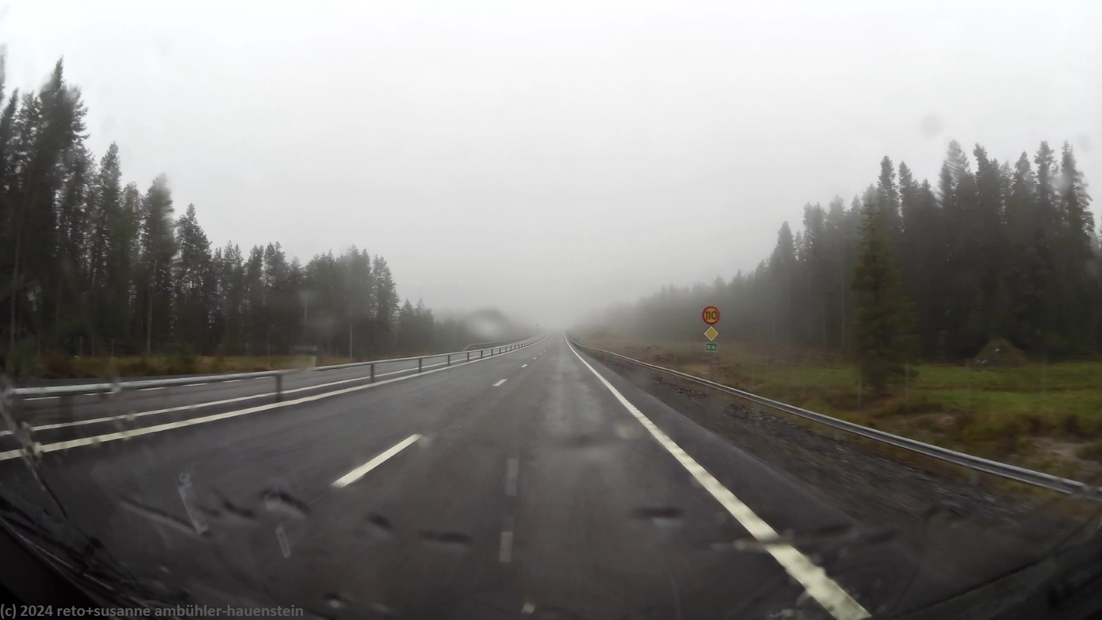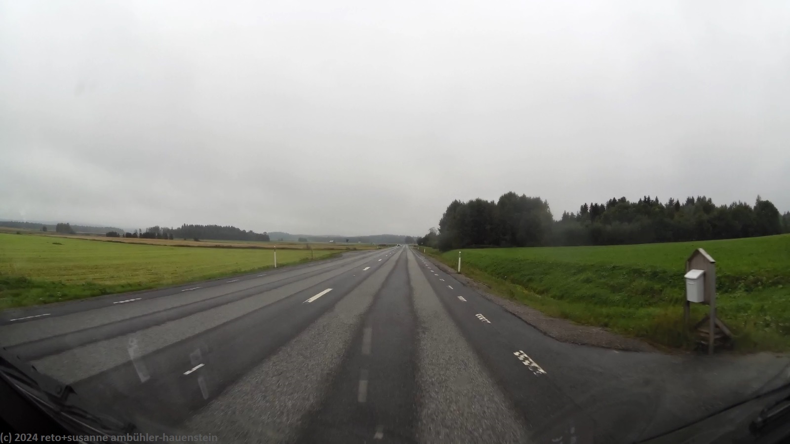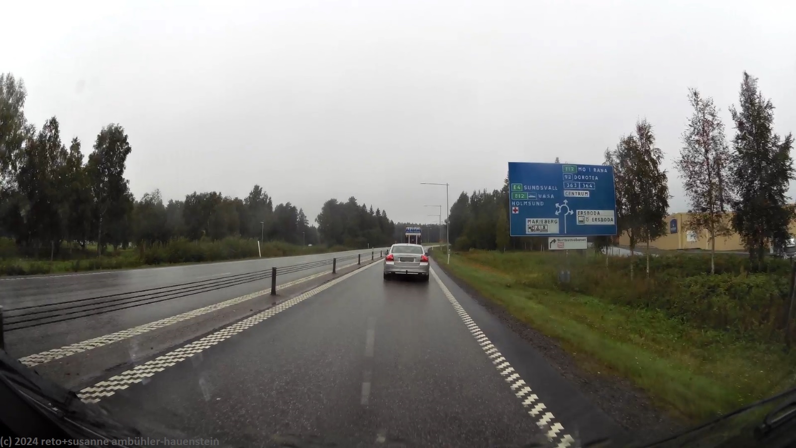wir schlafen bis fast 9 uhr. als wir aufstehen, prasselt ein heftiger regen auf unseren jogi. wir brauchen einen schirm, um zur toilette zu gehen. nach dem frühstück im wagen machen wir uns bereit für die weiterfahrt. kurz vor 10:40 uhr verlassen wir den campingplatz. die fahrt über die E4 ist sehr entspannt, es hat viel weniger verkehr, als ich erwartet hätte. abschnittsweise ist die strasse dreispurig, manchmal hat es in unsere fahrtrichtung eine überholspur, dann in die entgegengesetzte richtung. gelegentlich gibt es einen lastwagen zu überholen, aber das verkehrsaufkommen ist äusserst gering. der regen lässt bald nach, dafür fahren wir nun durch dichten nebel. südlich von bureå werden die dreispurigen abschnitte vorübergehend seltener. südlich dieser stadt zeigt der kilometerzähler unseres wagens 368000. gegen 13:30 uhr erreichen wir umeå. susanne hat die adresse eine cafes ins navi programmiert, aber rund um die adresse sind nichts als baustellen. wir parkieren deshalb in einem nahen parkhaus und machen uns zu fuss auf die suche nach dem cafe rost.