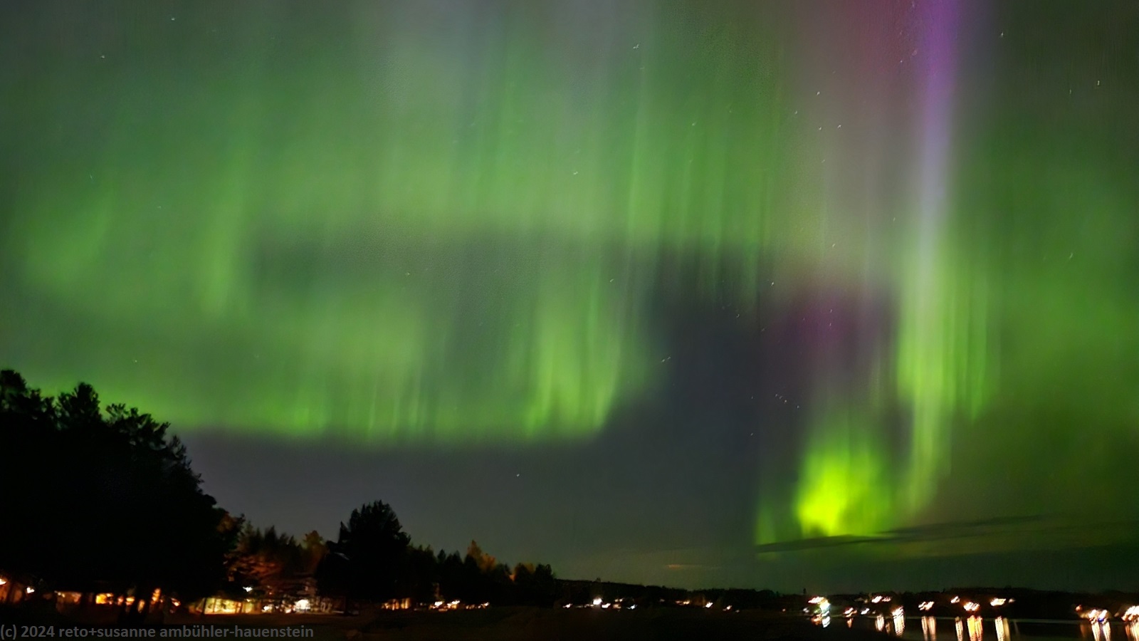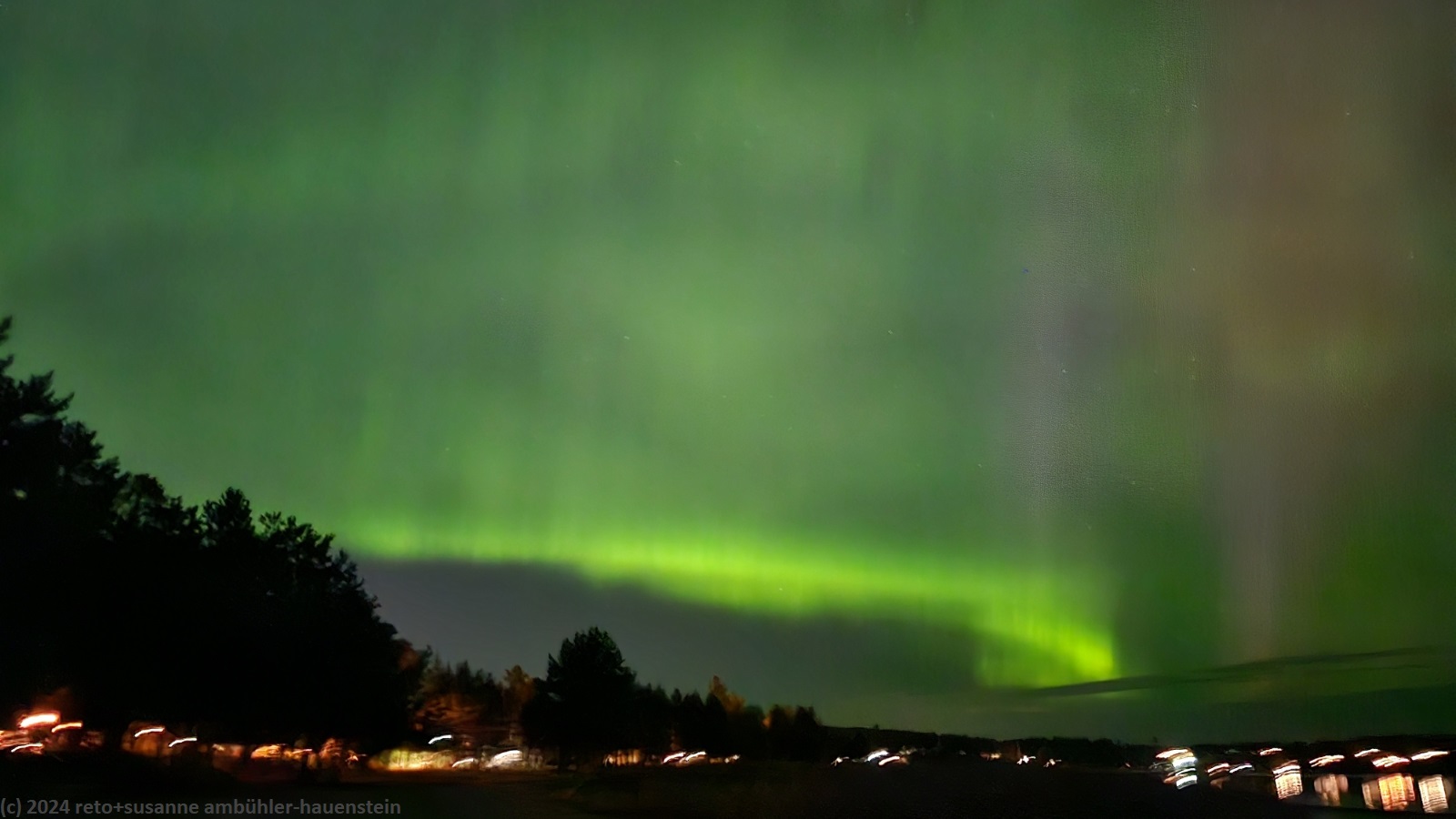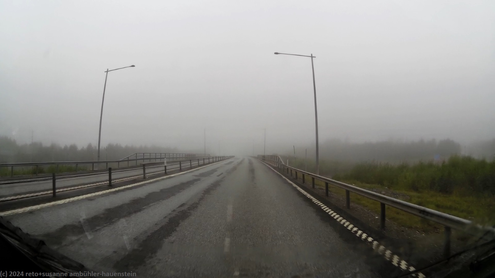 wir schlafen bis gegen 9 uhr. als wir aufstehen, prasselt ein heftiger regen auf unseren wagen. nach dem frühstück machen wir uns auf den weg richtung süden. die fahrt über die E4 verläuft entspannter als erwartet. der regen lässt zwar bald nach, dafür fahren wir immer wieder durch dichten nebel. gegen 13:30 uhr erreichen wir umeå, wo wir im cafe rost ein köstliches mittagessen geniessen. auf der weiterfahrt bessert sich das wetter zusehends, kurz nach 16 uhr wird es sogar richtig sonnig. besonders eindrücklich ist die fahrt über die högakustenbron, welche den ångermanälven überspannt. kurz vor 18:15 uhr erreichen wir unser tagesziel. der campingplatz am bergafjärden ist ziemlich voll. bevor wir uns einrichten, fahren wir zum ICA Kvantum in kvissleby um lebensmittel einzukaufen. das nachtessen können wir im freien geniessen. während wir essen fliegen hunderte wildgänse über den platz und versammeln sich im nahen fjord. nach dem abwaschen kommen wir in den genuss von polarlichter der extraklasse.