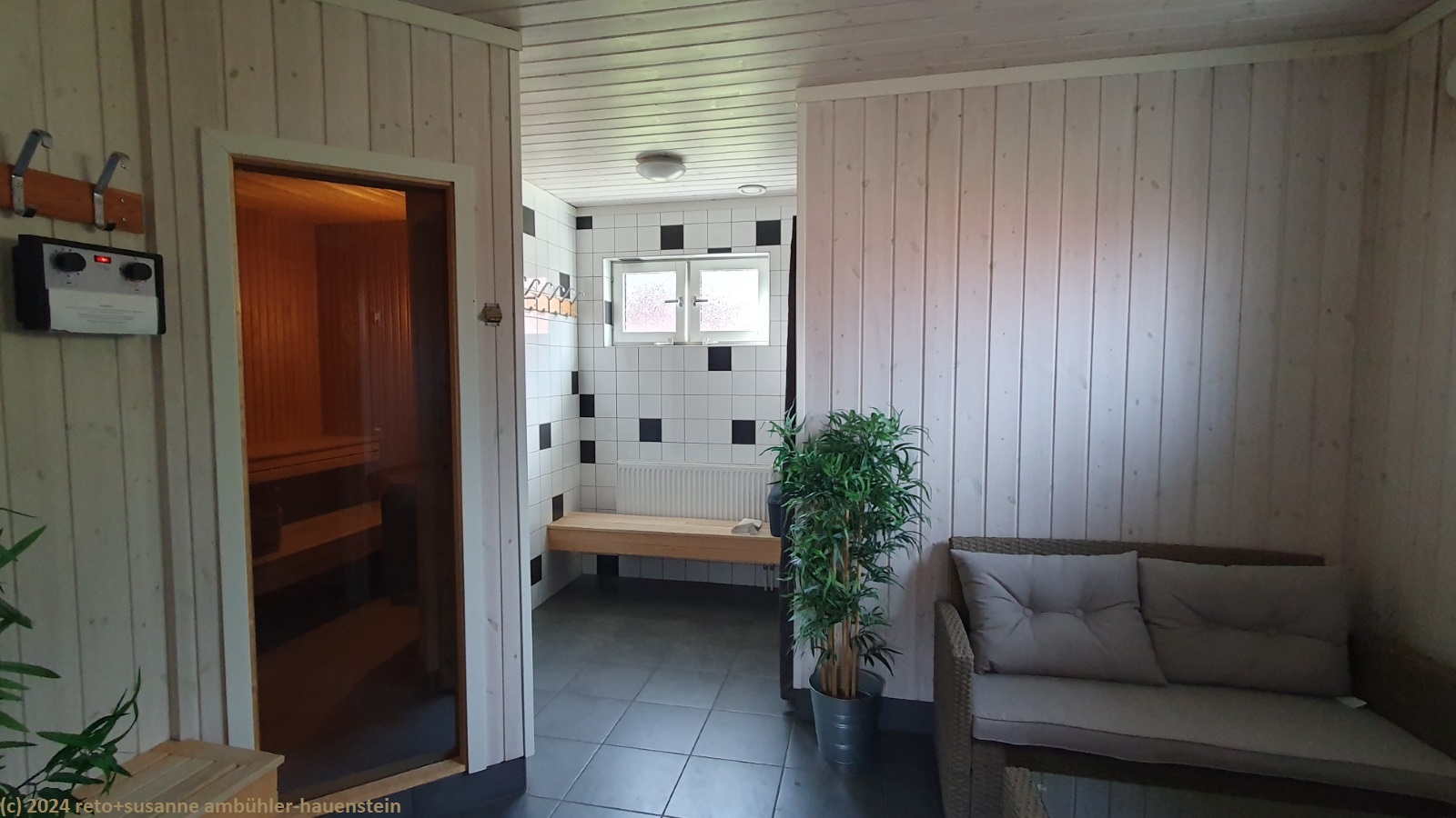 als alles verpackt ist, gehen wir zum empfang und bezahlen den parkplatz für die kommende woche. wir können unseren jogi auf dem parkplatz des restaurants stehen lassen. bei dieser gelegenheit lassen wir uns eine karte für die sauna aushändigen. wir stellen die schaltuhr so ein, dass die sauna um 17 uhr warm sein sollte. zurück beim jogi trinken wir eine tasse tee. nun ist es sonnig und richtig warm. als wir um 17 uhr in die sauna kommen, müssen wir feststellen, dass jemand am temperaturregler gedreht hat, sie ist gerade mal 26°C warm. wir drehen die temperatur wieder hoch und müssen uns eine halbe stunde gedulden, bis die sauna warm ist.