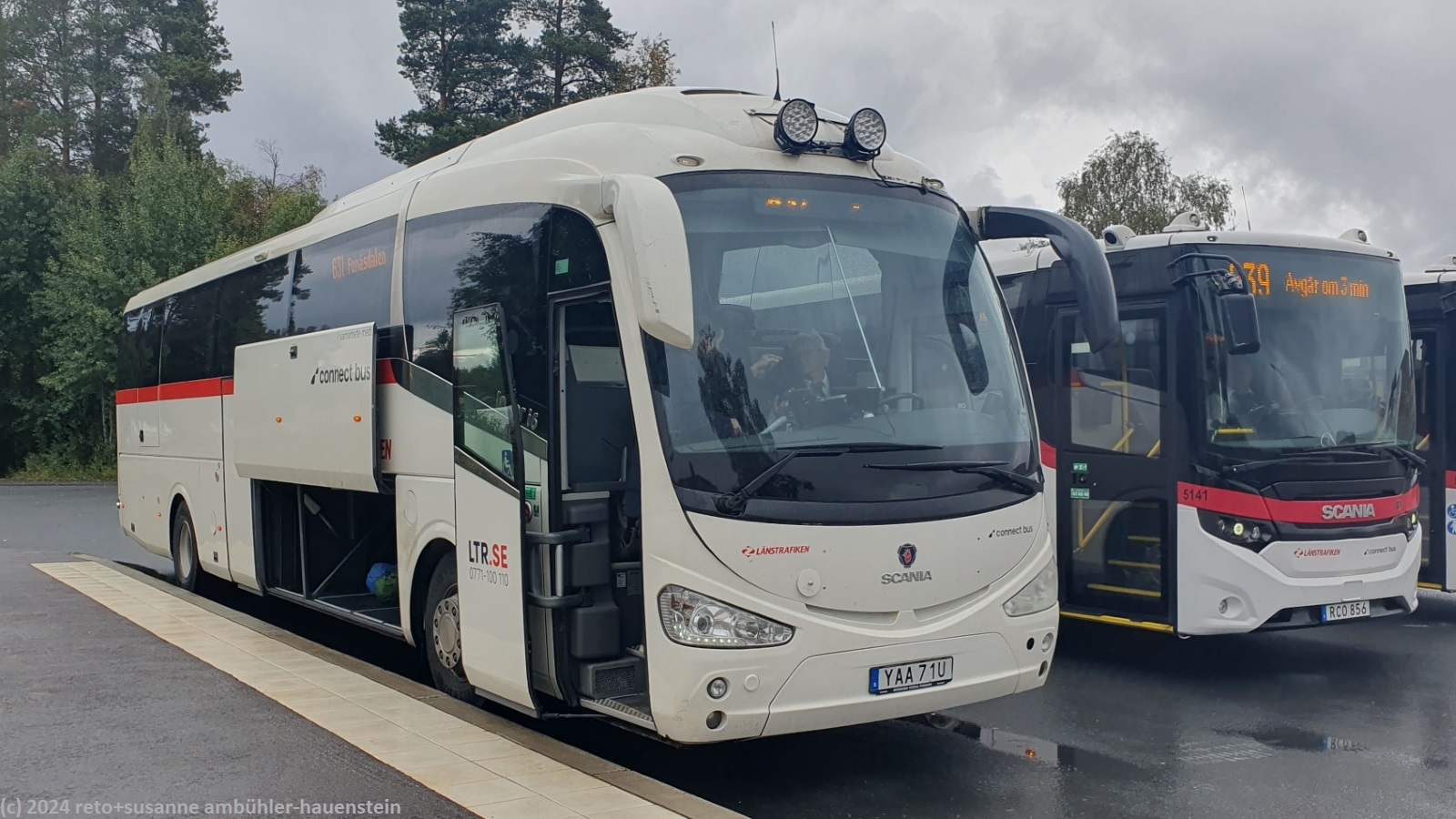 unser handy weckt uns um 6 uhr. wir ziehen uns an und fahren zum servicegebäude, in welchem wir frühstücken. anschliessend packen wir alles in unseren jogi, nur die rucksäcke lassen wir in der küche stehen. kurz nach 7 uhr fahren wir zum parkplatz und stellen unseren wagen ab. hoffentlich übersteht er die acht tage gut. zu fuss gehen wir zum servicehaus zurück und schultern die schweren rucksäcke. der fussmarsch zum reisezentrum beim bahnhof dauert eine viertelstunde. wir setzen uns in den wartsaal. der bus kommt pünktlich. ganze sechs passagiere sitzen im geräumigen überlandbus, uns eingeschlossen. die fahrt verläuft sehr ruhig. es regnet in unterschiedlicher intensität. das wetter sieht für die bevorstehende mehrtageswanderung nicht gerade sehr ermutigend aus. aus dem bus rufe ich bei der taxizentrale an, um den transport von funäsdalen nach fjällnäs zu organisieren. die dame meint, ich hätte das am vortag machen müssen. als ich ihr erkläre, dass gestern sonntag war und man übers wochenende keine reservationen machen könne, dies aber auf der website nicht vermerkt sei, meint sie, sie schaue, was sie machen könne, sie würde zurückrufen. tatsächlich klingelt wenig später mein telefon und wir erhalten die erfreuliche auskunft, dass uns heute abend ein taxi zum strandgården bringen werde. wir erreichen sveg mit einigen minuten verspätung. als wir aussteigen, fallen einzelne regentropfen. wir marschieren zum ICA und setzen uns ins restaurant. kaum sind wir durch die tür, geht draussen ein heftiger regen nieder, da haben wir wieder einmal glück gehabt. wir trinken einen kaffee, danach kaufen wir für's nachtessen ein. anschliessend setzen wir uns wieder ins restaurant und lesen. der regenguss war heftig aber kurz, einige minuten später scheint die sonne. das wetter spielt einmal mehr verrückt. gegen mittag gehen wir bei trockener witterung zum cafe cineast. wir kennen dieses von einem früheren besuch, siehe tagebuch vom 10-aug-2021. es gibt köstlichen käsekuchen mit ein bisschen salat und kaffee. für mich gibt es zusätzlich ein stück meringues, das schmeckt auch sehr lecker. um 13:45 uhr machen wir uns auf den weg zum bahnhof. kurz vor der bushaltestelle beginnt es wieder zu regnen.