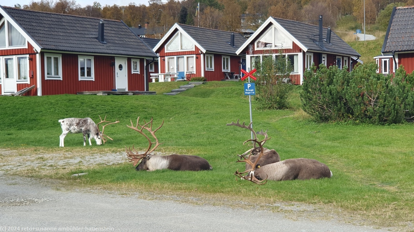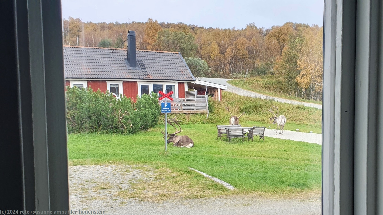 | rentiere auf dem parkplatz des strandgården bei fjällnäs | unsere hütte beim strandgården bei fjällnäs |