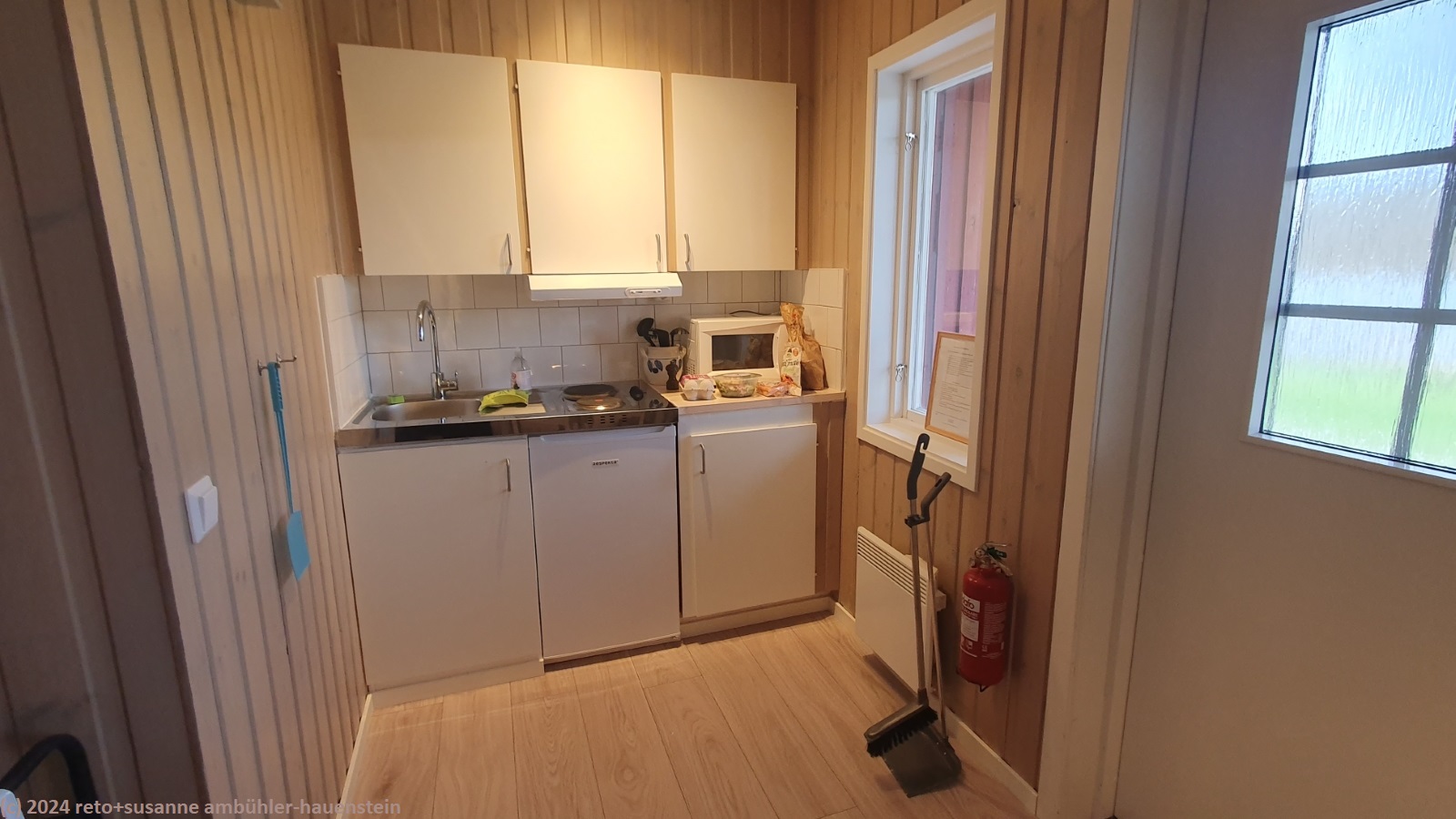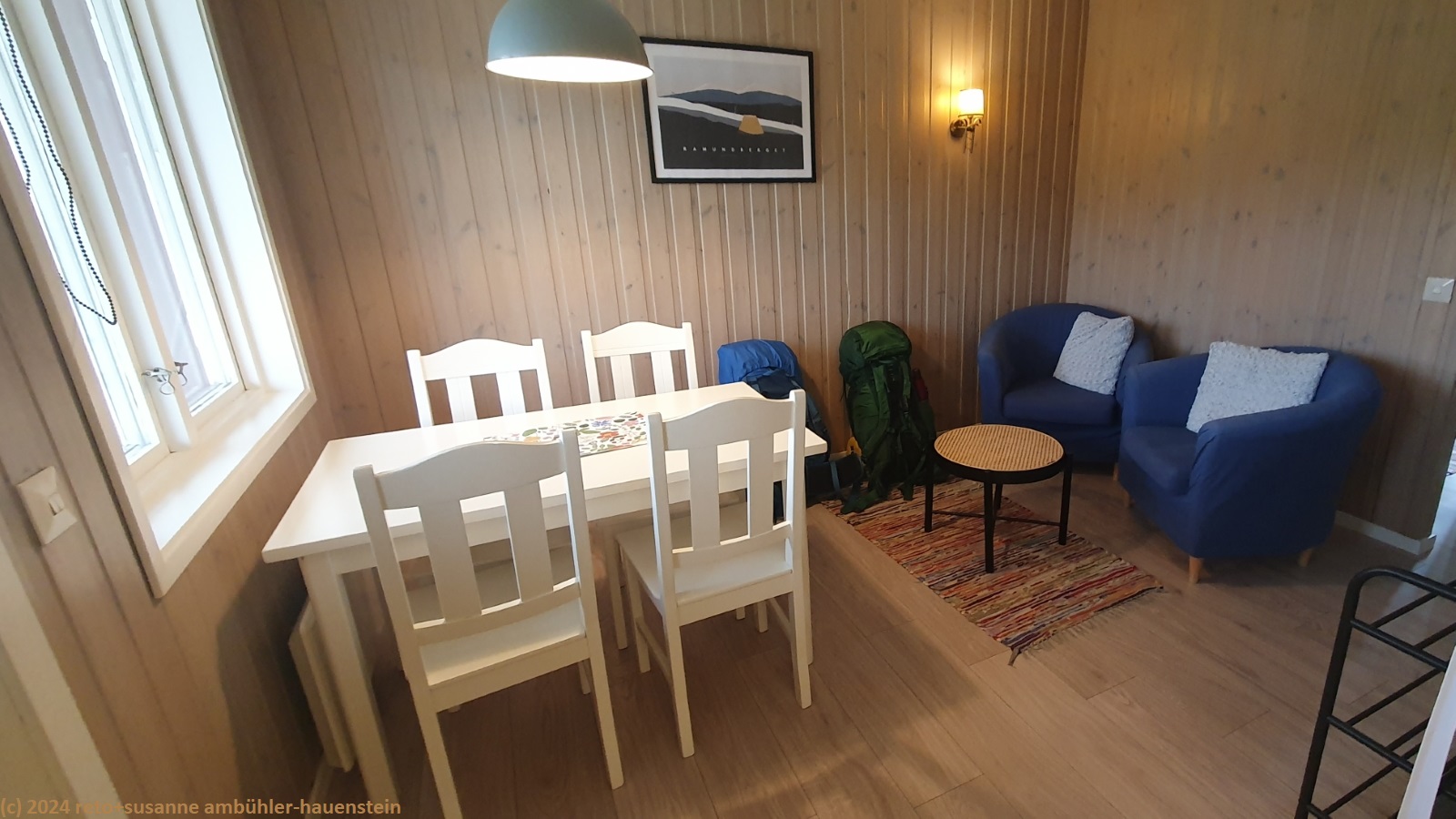 der bus fährt pünktlich. da das kartenlesegerät des busses keine verbindung zur zentrale hat, können wir die fahrkarte nicht mit kreditkarte bezahlen. so muss ich die app "länstrafiken jämtland" installieren, um den fahrpreis bezahlen zu können. ich habe allerdings den eindruck, der busfahrer hätte uns auch umsonst mitgenommen, es sei ja nicht unsere schuld, meint er. die fahrt nach funäsdalen verläuft entspannt. es sind etwa ein dutzend gäste im bus. das wetter ist weiterhin sehr wechselhaft. manchmal giesst es wie aus kübeln, bei unserer ankunft in funäsdalen hat es grössere flecken blauen himmel. wir erreichen den ort pünktlich und genauso pünktlich erscheint das taxi, welches uns nach fjällnäs bringt. die reise hat ganz wunderbar geklappt, das ist äusserst angenehm. vor dem hotel/restaurant strandgården liegen einige rentiere in der wiese und lassen sich durch unsere ankunft nicht im geringsten stören. eine dame, die sagt, sie sei hier gast, aber gerade damit beschäftigt ist, den rasen zu mähen, ruft die besitzerin unserer unterkunft an. diese kommt sofort aus dem haus und begrüsst uns äusserst freundlich. wir beziehen unsere hütte und richten uns ein. die unterkunft ist sehr gemütlich. es gibt eine kleine küche, einen esstisch mit vier stühlen und einen clubtisch mit zwei sesseln. im weiteren hat es ein schlafzimmer mit einem doppelbett und eines mit einem etagenbett sowie ein schönes badezimmer mit WC und dusche.