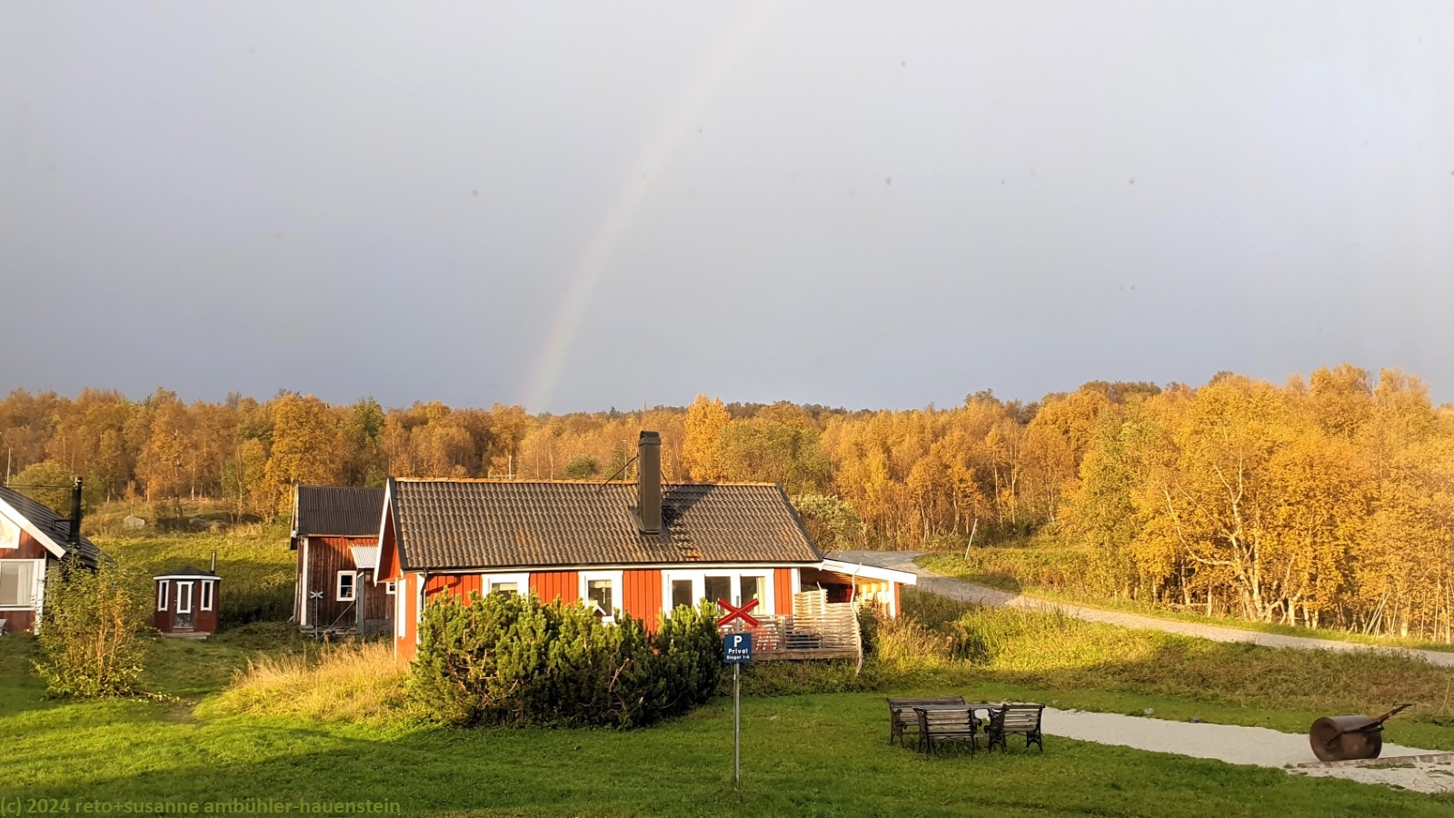 die besitzerin meint, wir sollen es uns gemütlich machen und wir könnten morgen so lange bleiben wie wir möchten. das klingt gut, denn die wettervorhersage für morgen verspricht regen, vorallem am vormittag. wir geniessen das abendessen in unserer heimeligen hütte. nach dem essen geht gerade wieder ein regenguss nieder und gleichzeitig scheint die sonne. durch unser schlafzimmerfenster sehen wir einen schönen regenbogen.