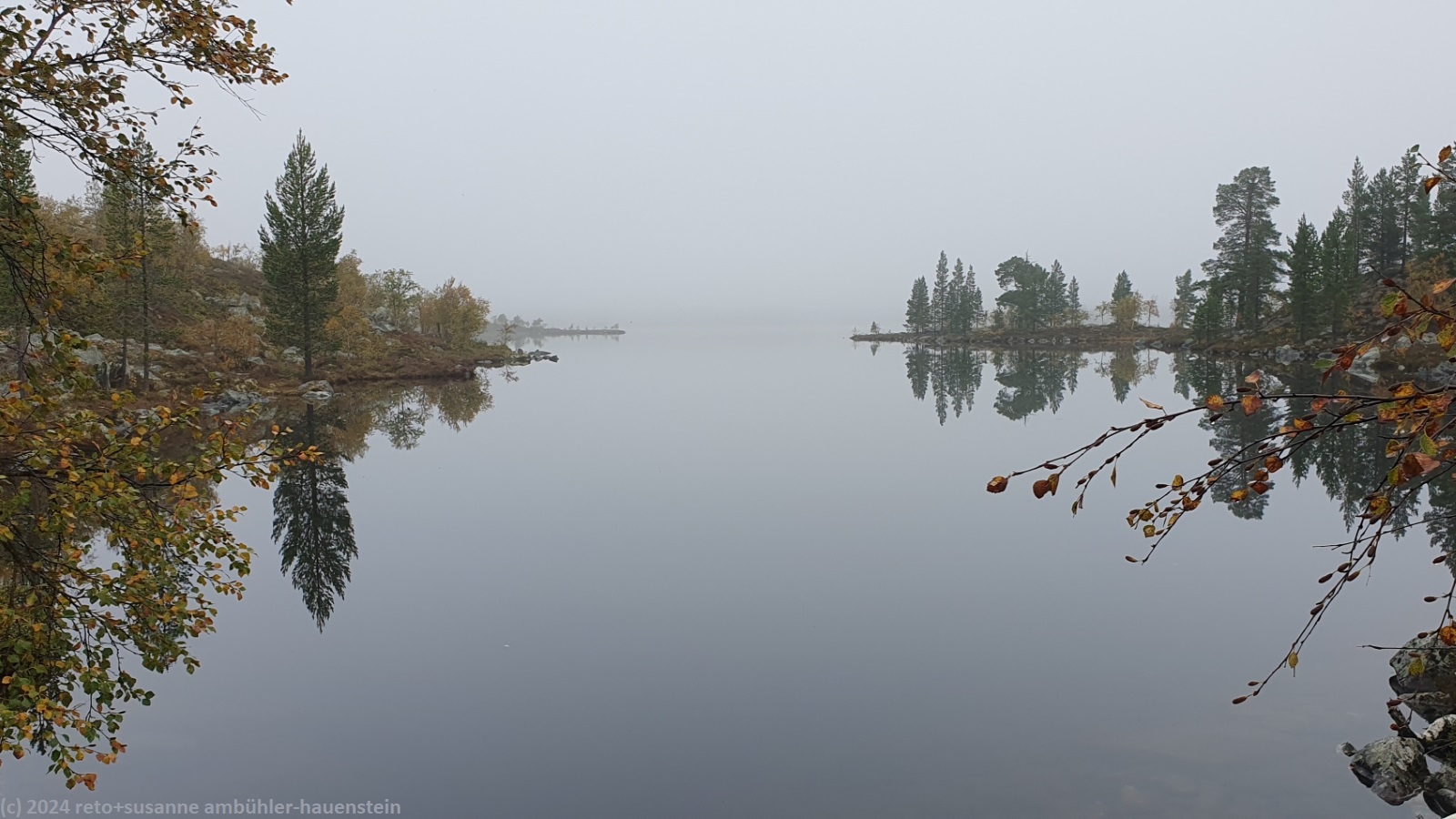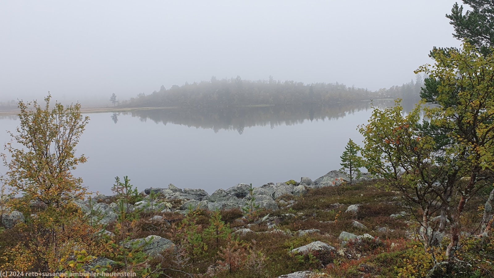 wir stehen um 7 uhr auf und nehmen überrascht zur kenntnis, dass es draussen regnet, obwohl ein sonniger tag angesagt ist. als wir um 08:30 uhr aufbrechen, hat der regen aufgehört, aber es herrscht dichter nebel. der blick über den see hat etwas mystisches. nach 75 minuten sind wir bei der abzweigung richtung reva und damit nur noch knapp 750 meter von norwegen entfernt. der nebel hat sich inzwischen aufgelöst und während wir an den beiden gipfeln des bustvålen vorbei wandern, scheint die sonne wie vorhergesagt. als wir gegen 12:45 uhr bei einer schutzhütte am rogen rasten, ist es so warm, dass wir uns am see abkühlen. nach dem mittagessen folgen wir dem ufer des rogen und erreichen kurz nach 16:30 uhr unser tagesziel rogenstugan. der hüttenwart begrüsst uns freundlich. um 18 uhr dürfen wir uns in die schöne und geräumige sauna setzen. zwischen den sitzungen kühlen wir uns im glasklaren see ab. nach dem nachtessen erleben wir eine wunderschöne abendstimmung über dem see.