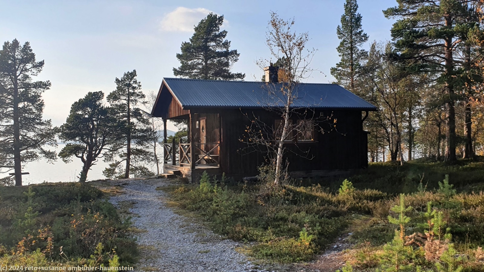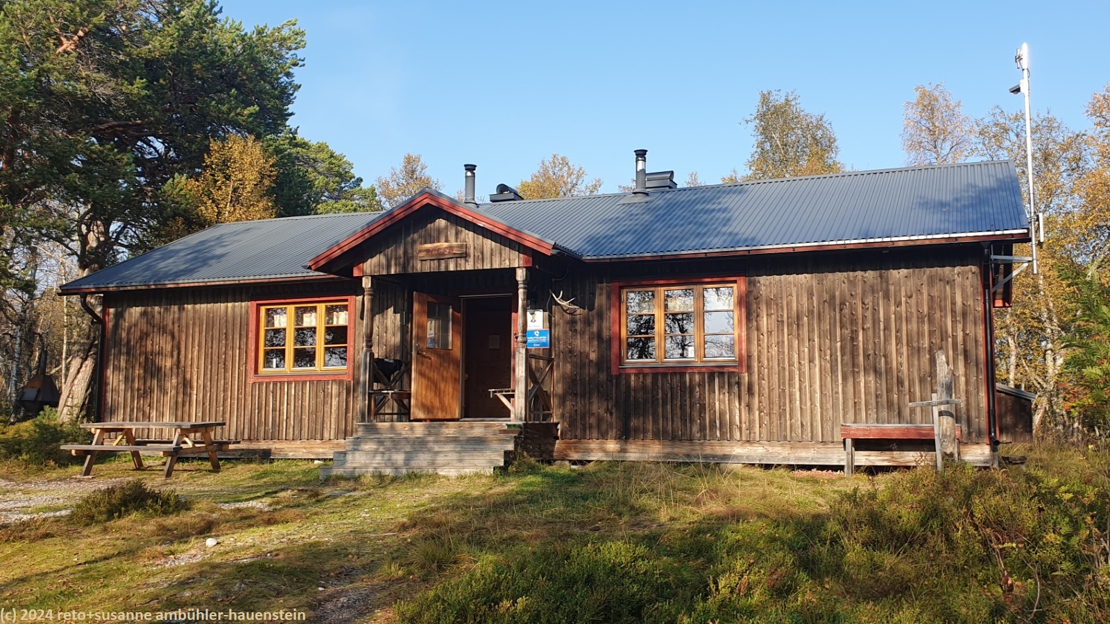 die aussicht von der hütte auf den rogen und die dahinterliegenden berge ist fantastisch. der hüttenwart begrüsst uns freundlich und meint, wir seien im moment die einzigen gäste. er erwartet noch ein schwedisches paar, welches aber erst spät ankommen wird. wir erhalten ein glas preiselbeersaft, der schmeckt fantastisch. auch diese stuga hat zwei räume mit je zwei schlafnischen. allerdings gibt es hier nur vier betten pro nische und nicht fünf, wie in den meisten anderen hütten dieser art. wir dürfen den einen raum in beschlag nehmen.