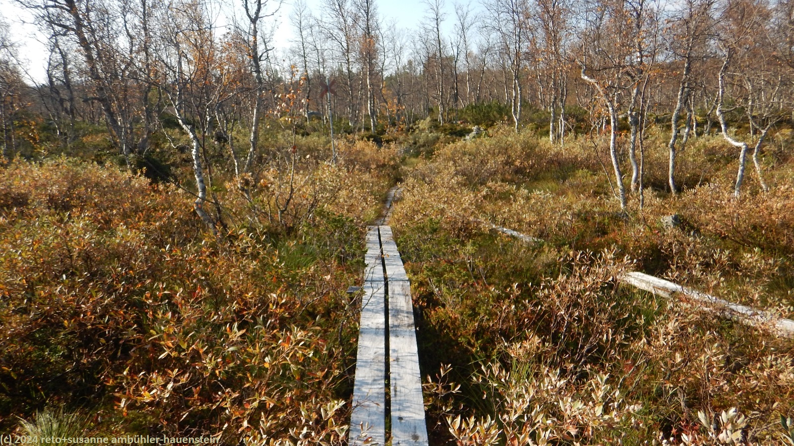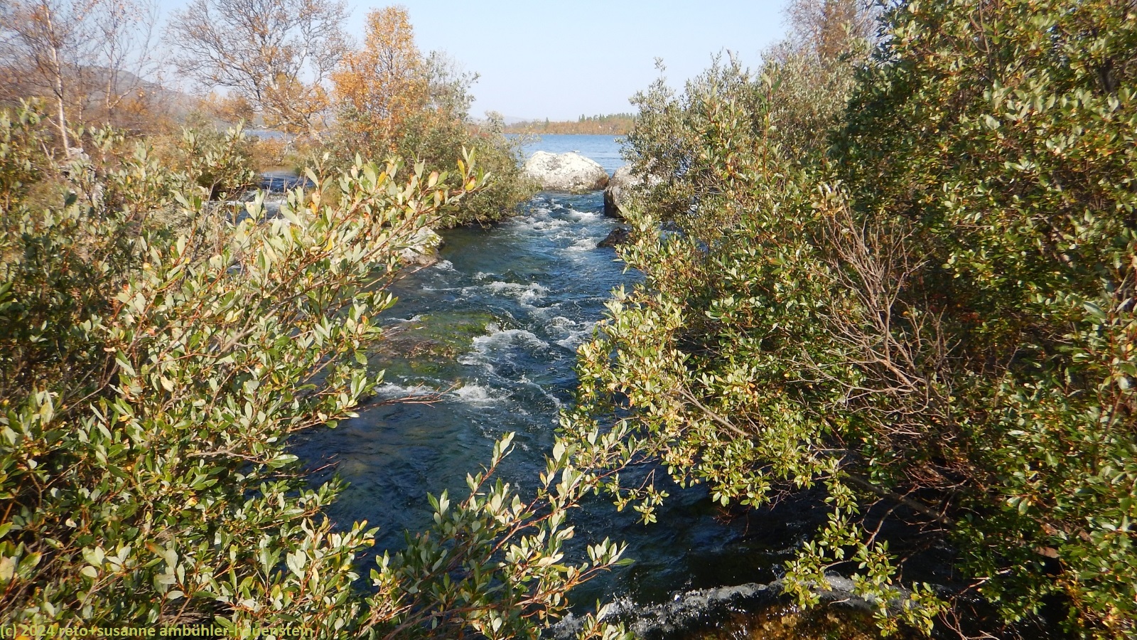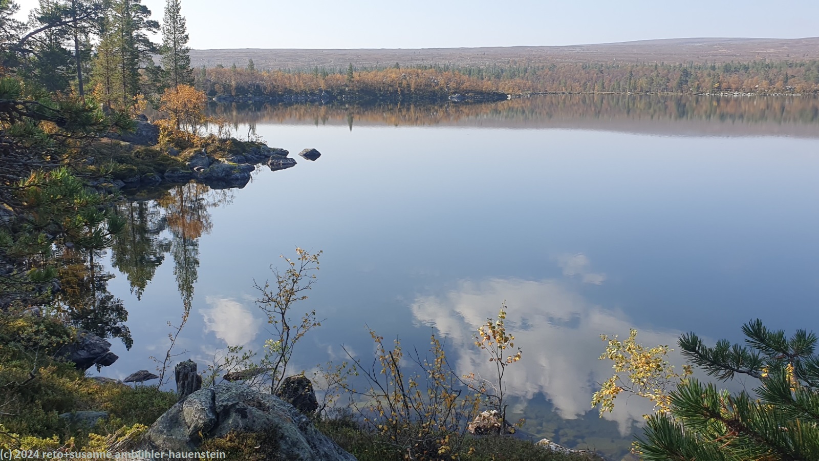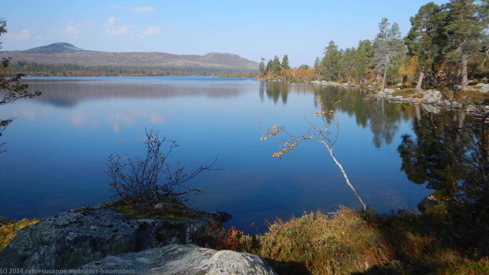 nach 15 minuten brechen wir wieder auf. eine brücke führt über die verbindung zwischen dem hävlingen und dem särsjön. hier füllen wir unsere trinkflaschen auf. der pfad folgt nun ein kurzes stück dem südlichen seeufer. wir haben eine fantastische aussicht über den hävlingen, in welchem sich der herbstliche wald spiegelt. dann dreht der weg langsam richtung süden und entfernt sich damit vom see. solange wir durch den wald wandern, ist der weg äusserst mühsam zu begehen, über der waldgrenze wird es einfacher. der weg steigt weiter kontinuierlich an, wobei die steigung eher abnimmt. gegen 12:30 uhr sind wir auf der höhe der schutzhütte särsjöbäcken. diese liegt knapp 250 meter vom wanderweg entfernt, direkt am winterpfad. querfeldein gehen wir zu hütte und essen auf deren treppe bei strahlendem sonnenschein zu mittag.