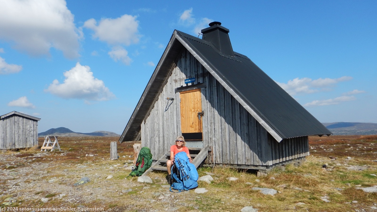 ein einzelner wanderer gesellt sich wenig später zu uns und kocht etwas abseits sein mittagessen. kurz nach 13:30 uhr brechen wir wieder auf. auf dem rückweg zum pfad füllen wir unsere wasserflaschen auf. bis auf weiteres ändert sich nicht viel an der landschaft. um 14:45 uhr machen wir nochmals kurz rast, essen einen stengel und trinken wasser. über einen mehr oder weniger steinigen weg geht es auf der flanke des jakobshöjden bergwärts. hoch über uns sehen wir einen markanten antennenmasten. am höchsten punkt machen wir noch einmal einen kurzen halt. nun geht es mit angenehmem gefäll talwärts. als wir die waldgrenze erreichen, wird der weg steiler und noch einmal richtig holprig. interessanterweise gibt es zahlreiche wegweiser, aber keinen, der richtung grövelsjön fjällstation zeigt. unser navi führt uns aber zielsicher direkt dorthin. um 16:30 uhr haben wir das tagesziel und damit auch das ende dieser mehrtageswanderung glücklich erreicht.