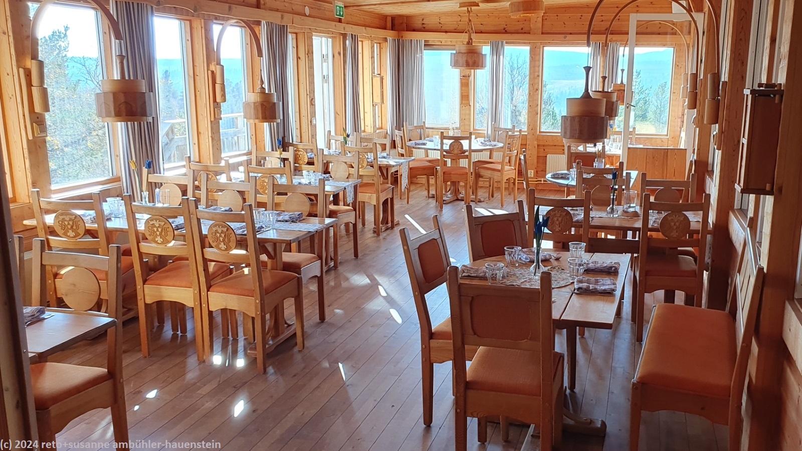 wir richten uns im zimmer ein, danach geniessen wir eine enorm erfrischende dusche. pünktlich um 17:30 uhr sind wir im restaurant. hier gibt es keine präsentation der küchenmannschaft, sondern es wird sofort die vorspeise serviert. die hauptmahlzeit dürfen wir am buffet holen. es gibt salate, kartoffelstock, mischgemüse und lachsburger. das schmeckt alles sehr gut. zur nachspeise wählt susanne einen blaubeerkuchen und ich vanilleeis mit moltebeeren. nach dem essen setzen wir uns in den gemütlichen leseraum. susanne liest, ich schreibe tagebuch. um 21:15 uhr ziehen wir uns in unser zimmer zurück und schlüpfen wenig später ziemlich erschöpft in unsere schlafsäcke.