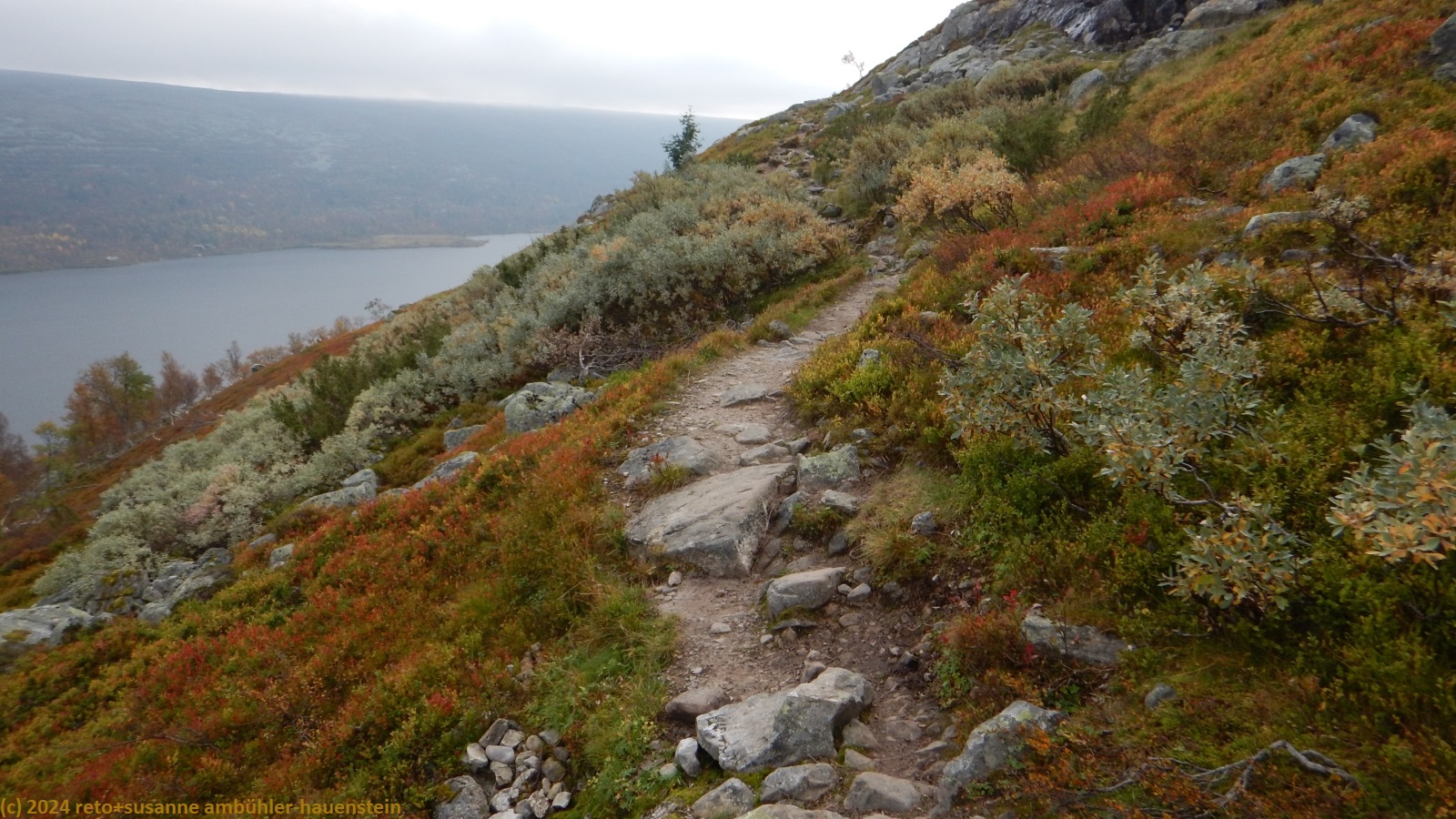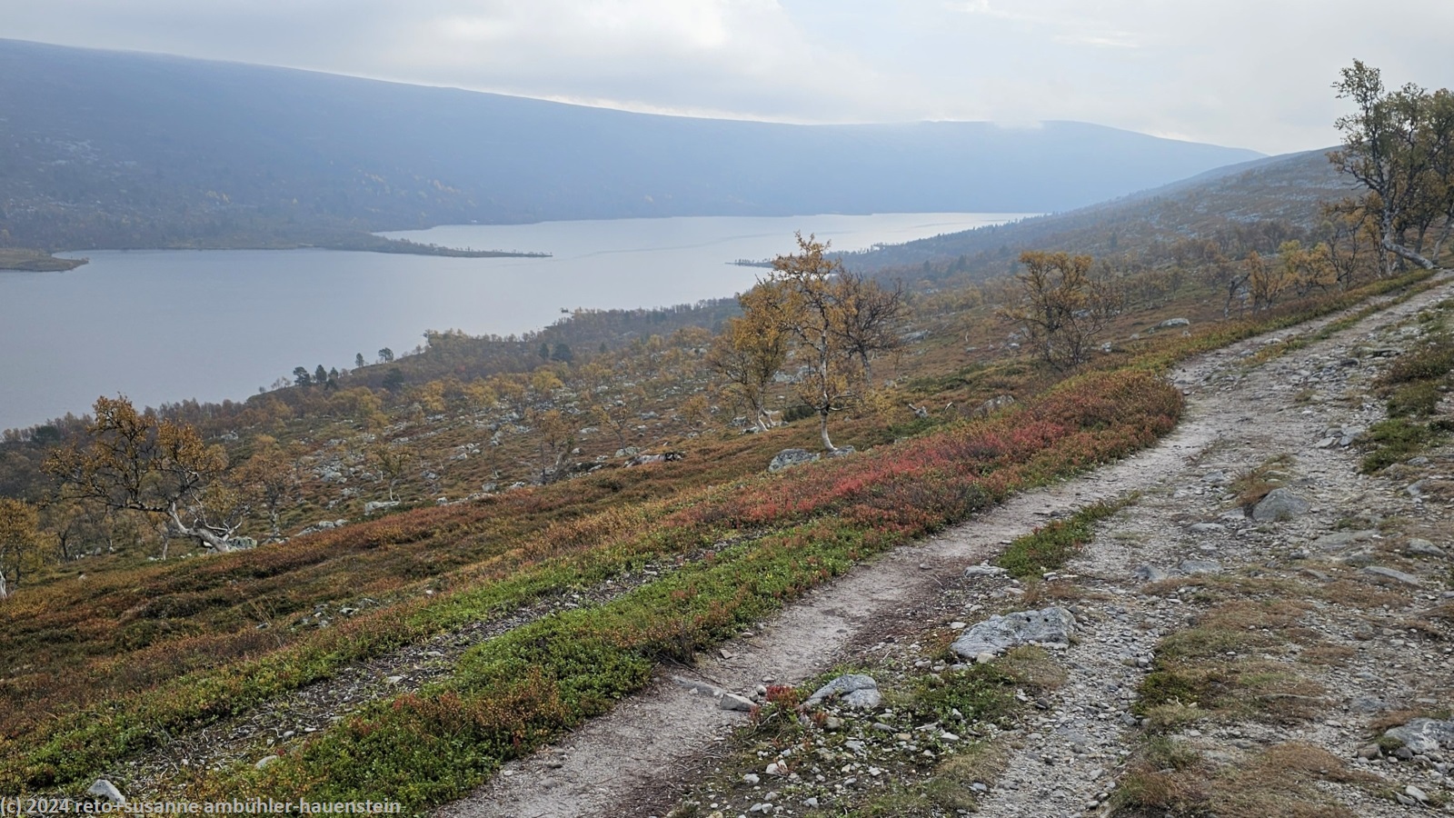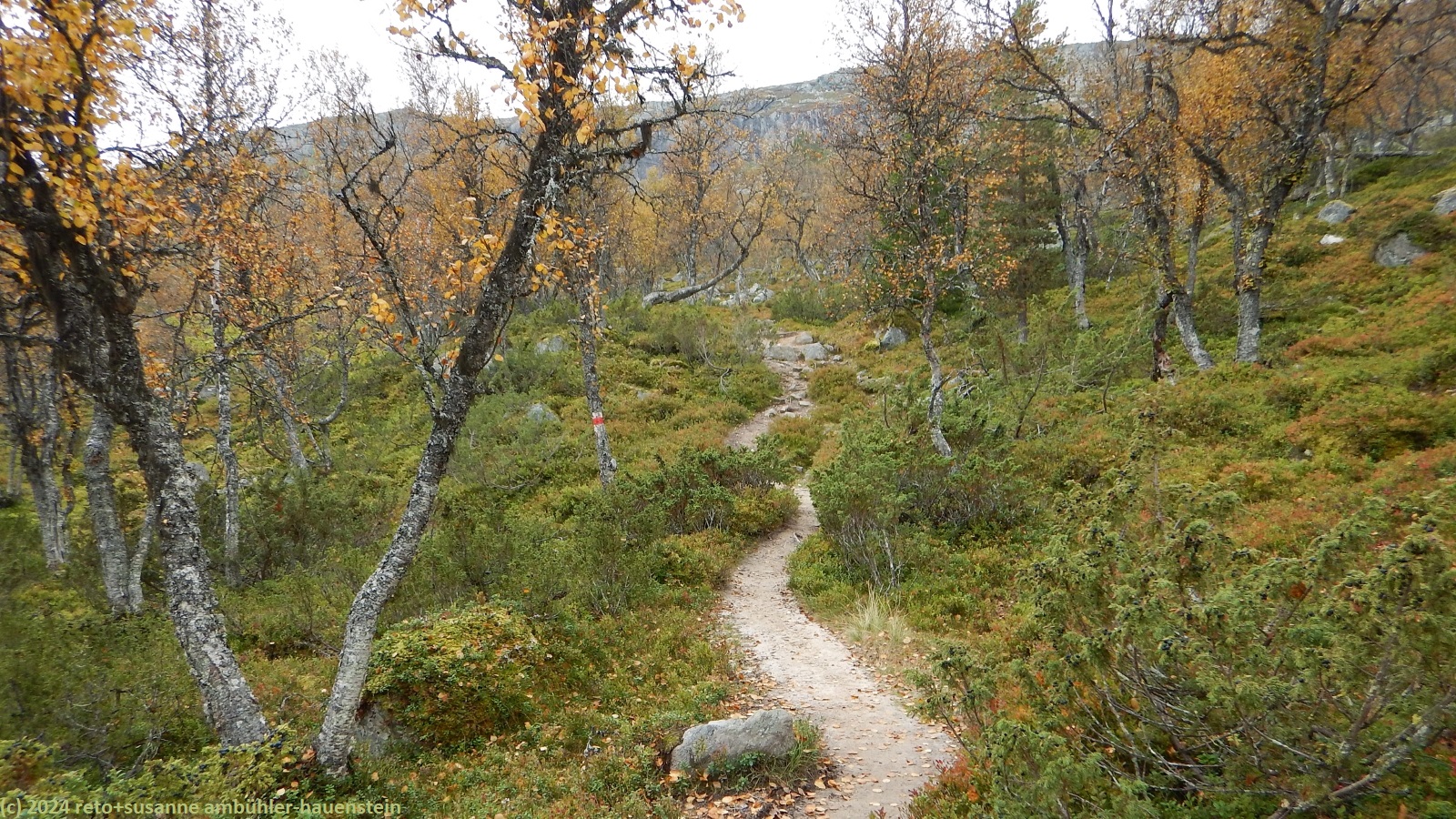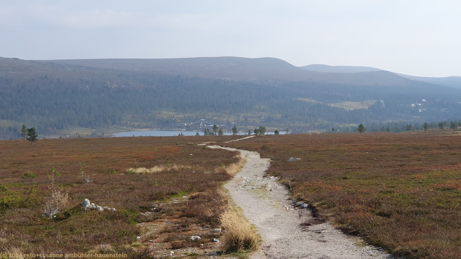 der himmel ist zwar immer noch bewölkt, aber wir sehen nun ab und zu blaue flecken und manchmal sogar für einen kurzen moment die sonne. der weg folgt erst ein kurzes stück dem grøvelåa entlang richtung ryvang, dann geht es südwärts. der pfad steigt nun recht steil an und führt durch einen wunderschönen herbstwald. anfangs geht es über die berüchtigten steine, aber mit dem leichten rucksack geht das viel einfacher. auf etwa 850 m.ü.m erreichen wir die baumgrenze. der weg steigt nun etwas weniger steil an. der wanderweg ist hier nicht ein einziger pfad, sondern es verlaufen mehrere trampelpfade mehr oder weniger parallel neben- und durcheinander. aus der ferne könnte man die wanderwege als strasse interpretieren. während dem aufstieg begegnen wir immer wieder anderen menschen. viele sind tagesausflügler wie wir, andere haben viel gepäck dabei und sind wohl länger unterwegs. auf dem weg zum höchsten punkt bläst uns ein mässiger wind ins gesicht. mit 1065 m.ü.m haben wir ersteren erreicht. nun senkt sich der pfad sanft talwärts. wir würden gerne picknicken, aber das ist gar nicht so einfach. wir befinden uns im femundsmarka nationalpark und entlang des weges hat es immer wieder schilder, dass man den pfad nicht verlassen darf. so direkt am weg essen möchten wir aber auch nicht. schliesslich kommen wir an einem grösseren felsen knapp neben dem weg vorbei, bei diesem rasten wir.