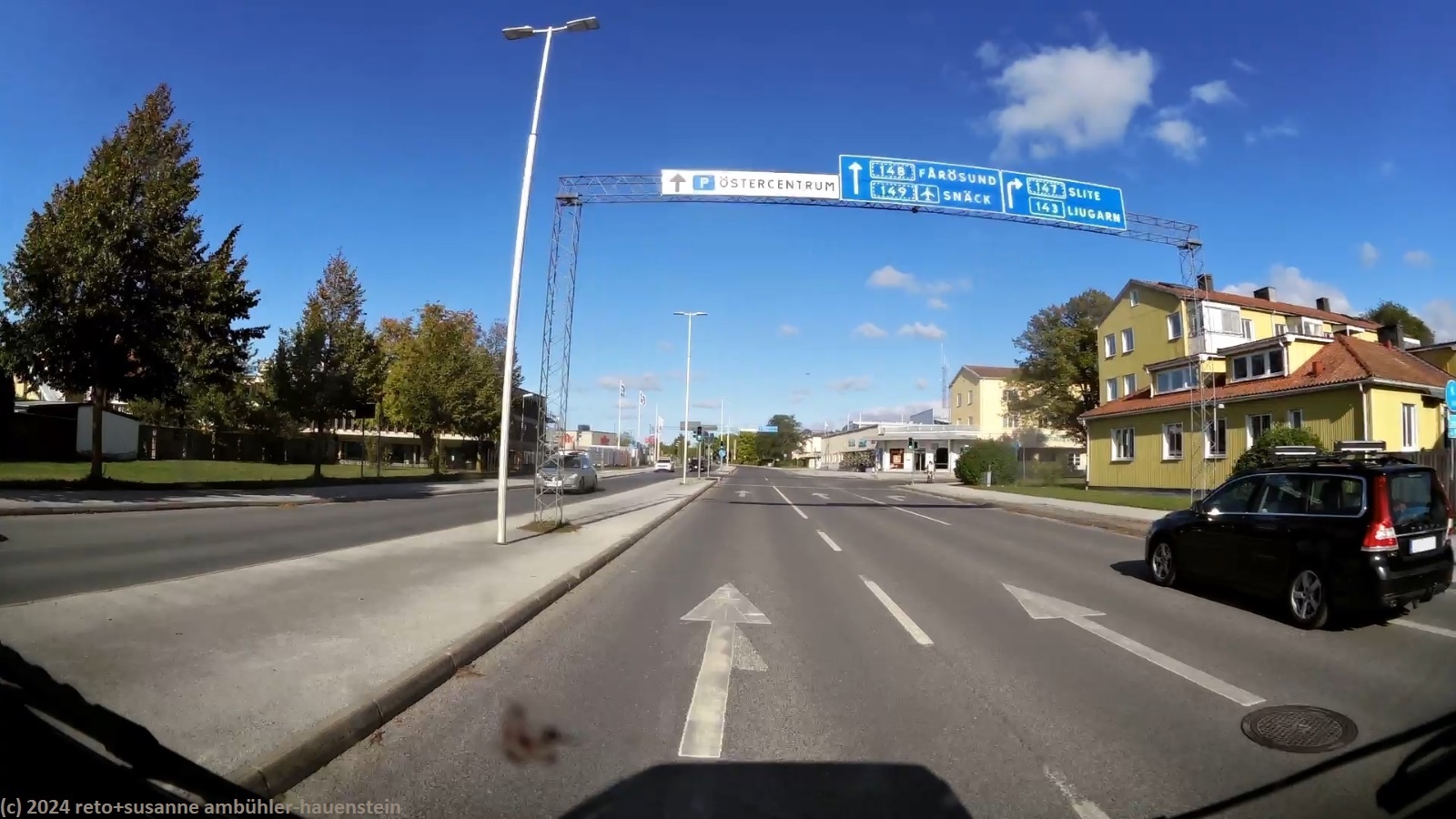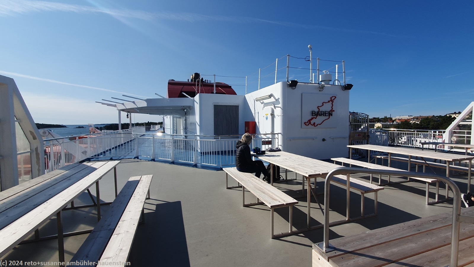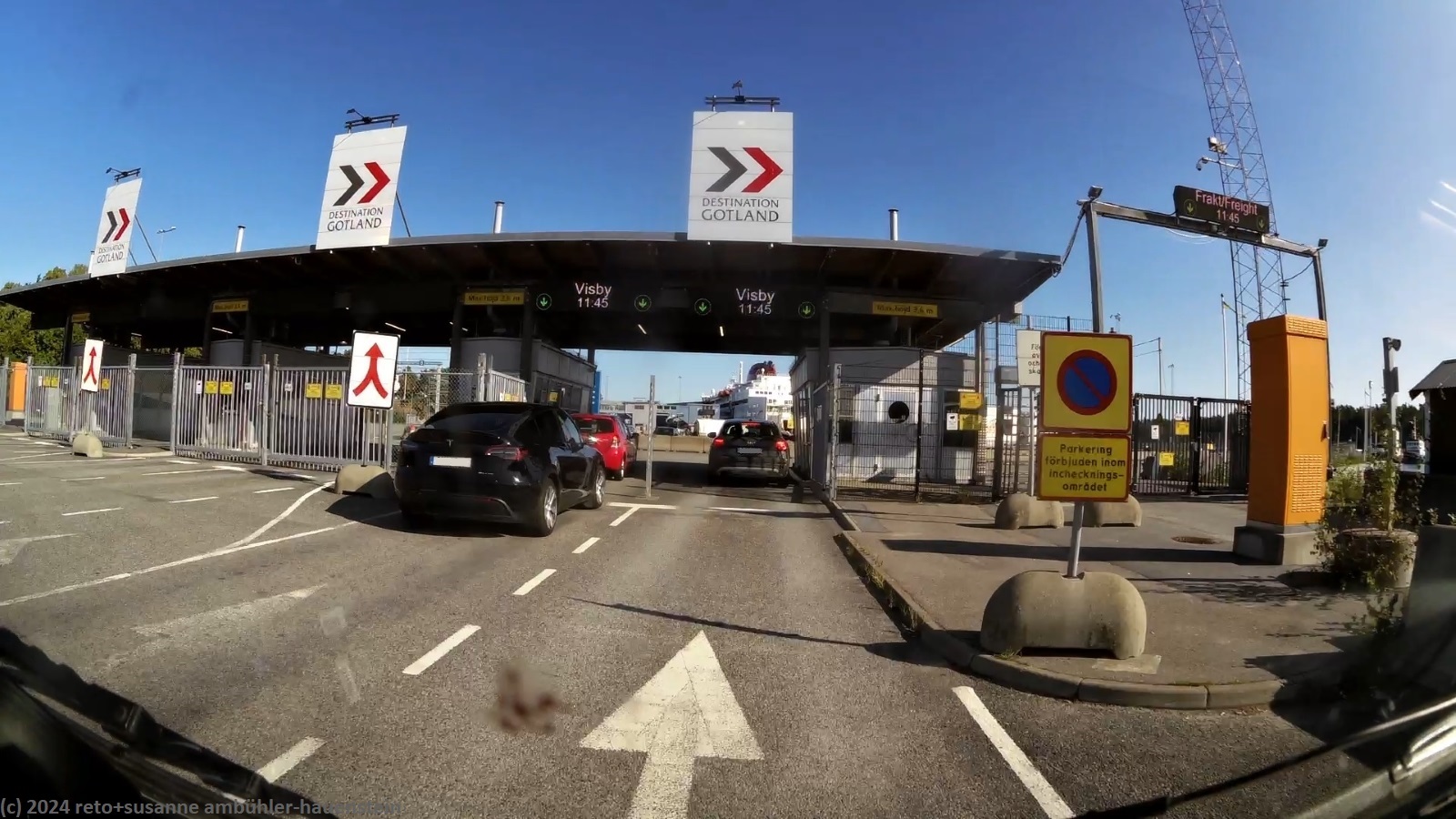 unser handy weckt uns um 07:30 uhr. wieder erwartet uns ein strahlend blauer himmel, so dass wir im freien frühstücken können. wie geplant machen wir uns um 09:30 uhr auf den weg richtung nynäshamn. erst geht es bei regem verkehr über die strasse 274 westwärts. vorallem in der gegenrichtung sind viele autos unterwegs. viele stockholmer machen wohl an diesem sonnigen tag einen sonntagsausflug heraus aus der stadt. bei arninge tanken wir unseren wagen auf, dann geht es auf der autobahn E18 richtung schwedens hauptstadt. erstaunlicherweise schlägt unser navi vor, mitten durchs stadtzentrum zu fahren. uns scheint das keine so gute idee, wir folgem deshalb dem autobahnring E20 und umfahren die stadt. auch hier herrscht dichter verkehr, aber wir kommen sehr gut voran, so dass wir unseren entscheid nicht bereuen. südlich der stadt geht es auf der autobahn 73 südwärts richtung nynäshamn. der verkehr nimmt rasch ab, nachdem wir die 70er-zone endlich hinter uns haben, geht es zügig vorwärts. kurz vor 11 uhr sind wir im hafen von nynäshamn. der check-in geht problemlos. noch bleiben knapp 45 minuten bis zur fahrplanmässigen abfahrt. susanne liest im auto, ich schreibe tagebuch. plötzlich setzen sich die fahrzeuge vor uns in bewegung. rasch nehme ich hinter dem steuer platz und fahre an bord.