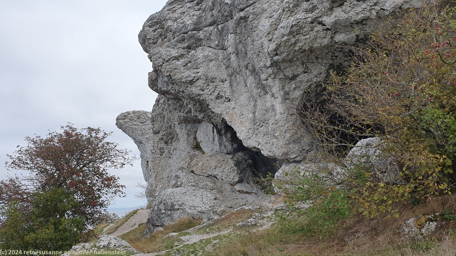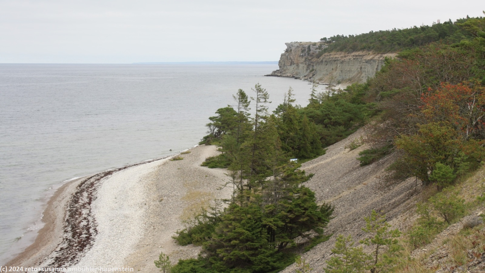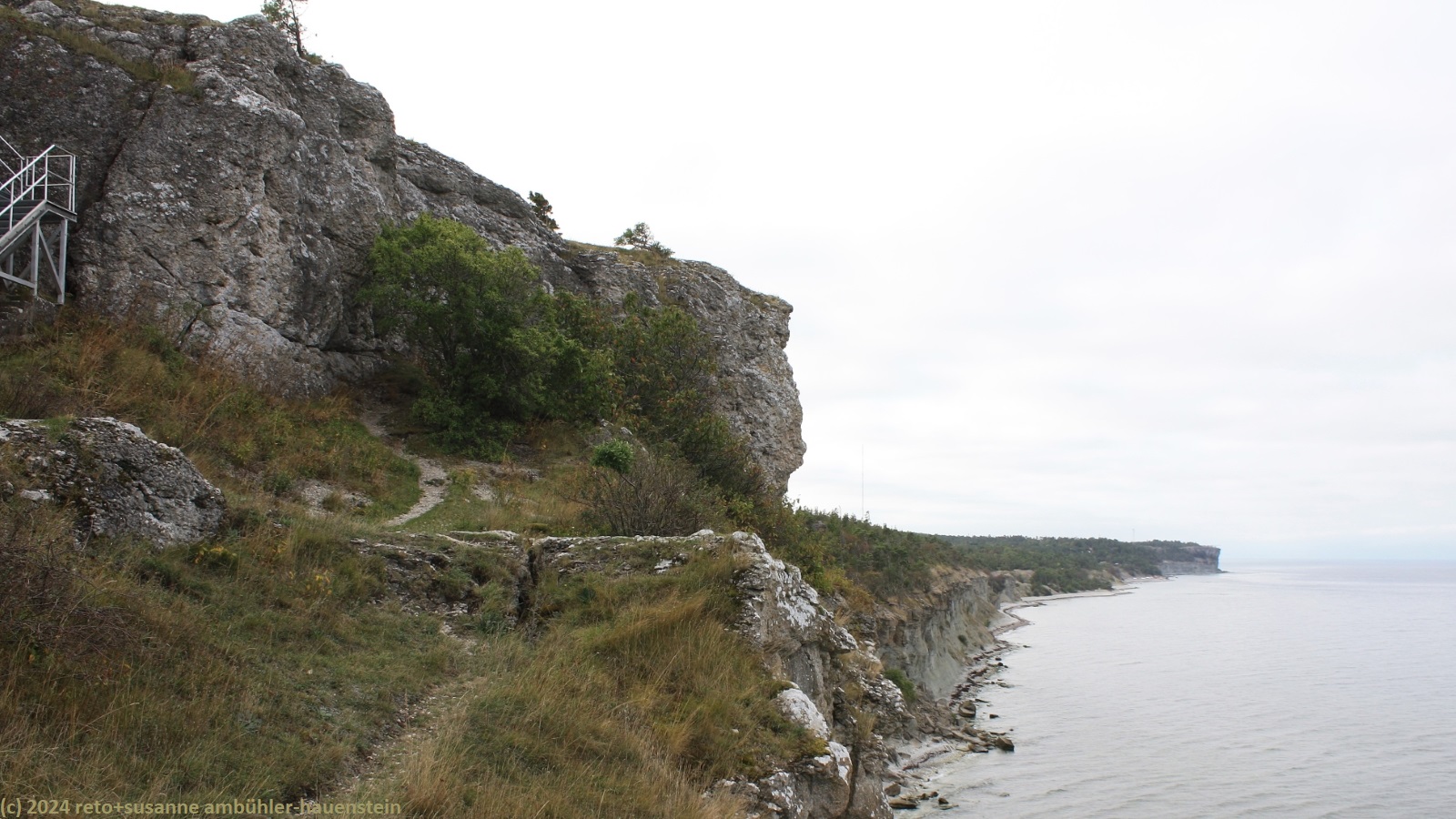 diese bis zu knapp 50 meter hohe steilküste erstreckt sich wenige kilometer südwestlich von visby. ganz in der nähe des parkplatzes befindet sich der höchste punkt der küste. von hier hat man eine tolle aussicht auf den hafen von visby. eine metalltreppe führt auf etwa halbe höhe der steilküste hinab. unter dem höchsten punkt hat es eine höhle. bei manchen ausgesetzten felsen sieht man tiefe risse im boden, da halten wir uns lieber fern. wir folgen dem weg entlang der klippe. dieser senkt sich langsam richtung meereshöhe. nach etwa einem kilometer kommen wir zum wasser hinunter. der strand ist mit rundgeschliffenem kies übersät. allerdings hat es auch angeschwemmte algen, die sehen etwas weniger hübsch aus. ein schmaler pfad führt auf die kante der steilküste hinauf, dann geht es auf dem gleichen weg zurück zum parkplatz.