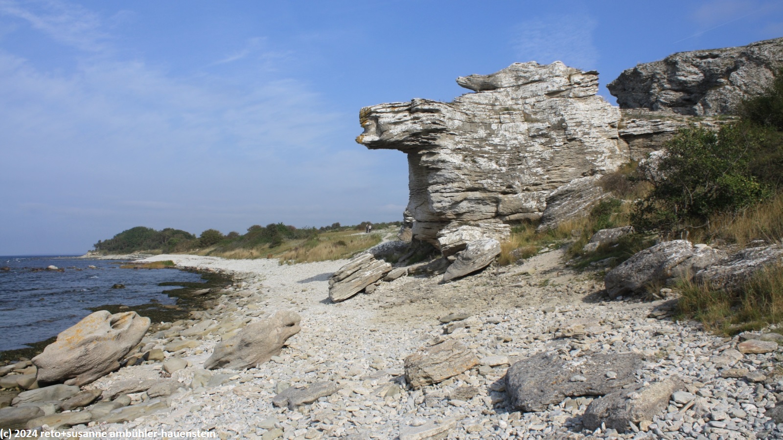 wieder kehren wir zur strasse 140 zurück. wir folgen nun der westlichen küste südwärts. ab klintehamn verläuft die strasse im landesinneren. gegen 13 uhr erreichen wir burgsvik. auf wunsch meiner frau verzichten wir darauf, im einzigen restaurant zu mittag zu essen und fahren weiter bis hoburgen in der nähe der südspitze von gotland. dort picknicken wir an einem tisch des geschlossenen restaurants. um diese jahreszeit hat fast alles auf dieser insel zu. nach dem essen spazieren wir zu den raukar, welche auch hier zahlreich vorhanden sind.