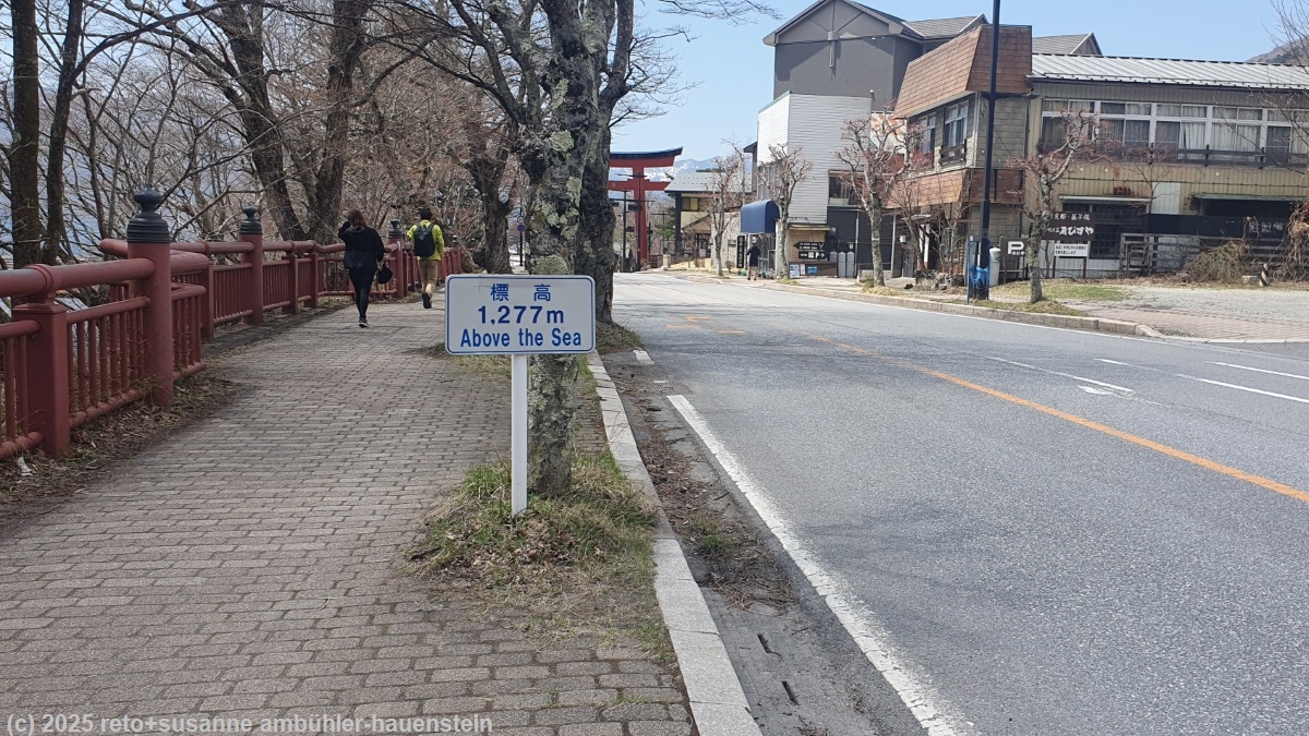 es empfängt uns ein bedeckter himmel und es bläst ein kühler wind. vor der weiterfahrt haben wir zeit, im nahen familymart picknick einzukaufen. mit einem bus fahren wir zum lake chunzenji, einem hübsch gelegenen see auf über 1200 m.ü.m. die fahrt führt über eine äusserst spektakuläre, kurvenreiche strasse. bis chugushi hat es über ein duzend spitzkehren. von der bushaltestelle spazieren wir zum seeufer und folgen diesem richtung westen. der wanderweg verläuft zwischen der strasse 120 - genannt "japan romantic highway" - und dem steinigen seeufer. gegen dorfende hat es hoch über dem see einen holzsteg mit bänken. auf einer solchen essen wir zu mittag. der himmel hat sich aufgehellt, die sonne scheint, aber der kühle wind bläst nach wie vor.