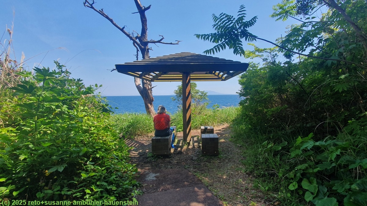 es dauert fast eine halbe stunde, bis wir aus städtischem gebiet herauskommen. später erkennen wir in der ferne die unverwechselbare silouette des fuji. doch noch bevor wir ein foto schiessen können, verschwindet der berg hinter einer bewaldeten bergkette. in atami müssen wir auf einen regionalzug umsteigen. der fahrplan deutet darauf hin, dass nicht der ganze zug bis zum endbahnhof fährt, aber wir können nicht mit sicherheit herausfinden, wo genau der zug allenfalls getrennt wird. da in unserem wagen als endziel ein bahnhof nach der station, bei welcher wir aussteigen wollen, angezeigt wird, gehen wir davon aus, dass es gut kommt. so ist es dann auch. wie geplant erreichen wir den bahnhof jogasaki kaigan um 11:29 uhr. wir verlassen den kleinen bahnhof und marschieren durch den ort bis zum startpunkt des jogasaki coastal trail. dieser folgt der küste südwestwärts bis izukogen. anfangs ist der weg ganz neu gemacht. der belag besteht aus holzschnitzel, welche mit roter farbe fixiert wurden. wir wandern durch einen sehr schönen wald. in diesem ist es äusserst angenehm. zum einen spenden die bäume schatten, zum andern schützen sie uns vor dem lästigen wind. entlang des weges hat es verschiedene attraktionen. wegweiser zeigen richtung und distanz zu den nächstgelegenen attraktionen. die erste attraktion ist die kadowaki hängebrücke, danach folgt der kadowakicape leuchtturm. die wilde küstenlandschaft ist geprägt von dunklem vulkanischem gestein. dieses bildet einen wunderschönen kontrast zum tiefblauen wasser und den weissen schaumkronen. bei einem picknickplatz mit wunderbarer aussicht auf den ozean essen wir zu mittag.