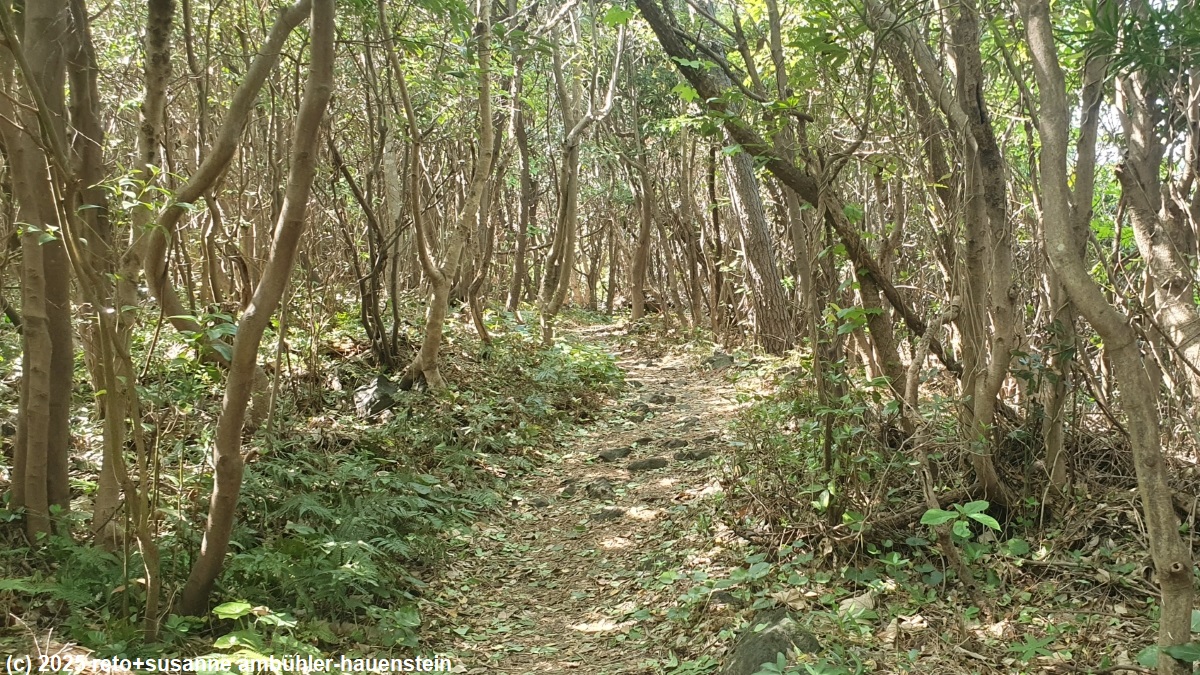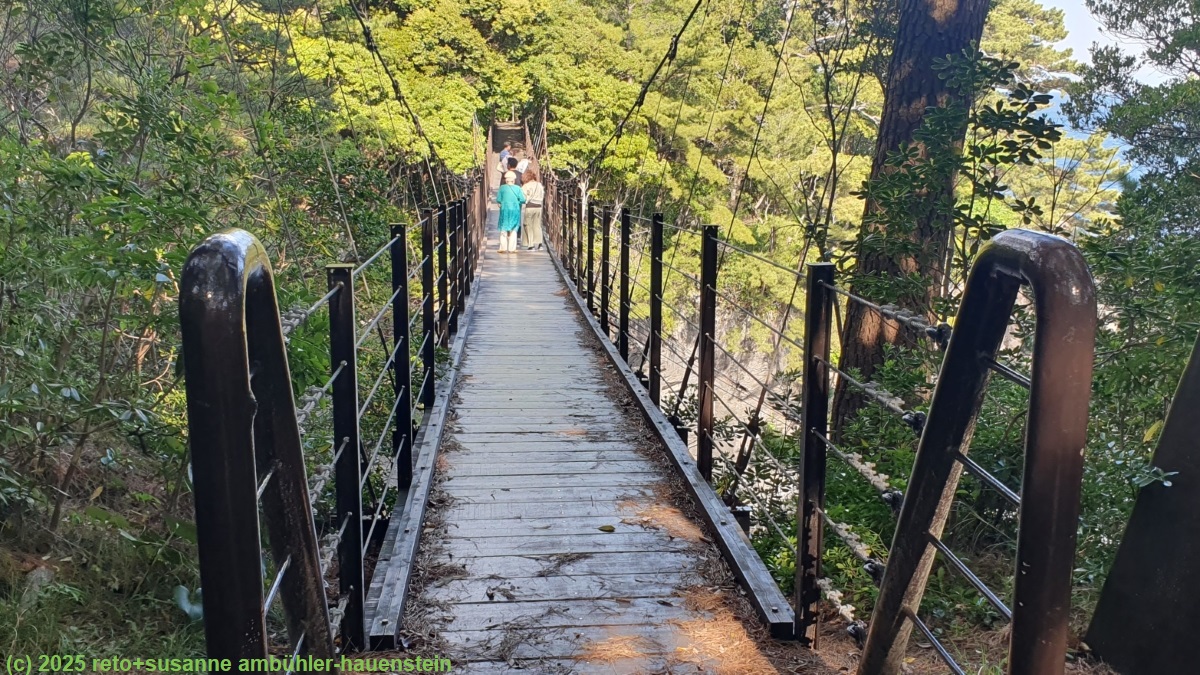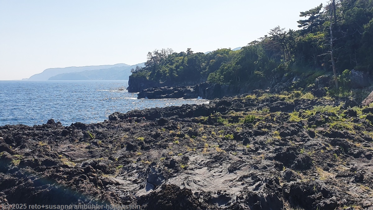 danach geht es weiter auf dem abwechslungsreichen weg. es gibt kurze auf- und abstiege und auch der wald ändert immer wieder. manchmal sind die bäume hoch und stehen etwas weiter auseinander, dann sind sie wieder klein und dicht. dazu kommen kleine landzungen mit vulkanischem gestein und schmale buchten mit grossen steinen. ich liebe das rauschen des meeres und das geräusch der ans ufer laufenden wellen, die an manchen stellen kräftig auf die senkrecht stehenden felsen prallen. gelegentlich entdecken wir die markanten, fünfeckigen basaltsäulen, wie wir sie auch auf island gesehen haben. gegen 15 uhr erreichen wir die hashidate hängebrücke und wenig später das ende des coastal trails in der nähe des yawatano fischerhafens. von da führt uns unser navi richtung bahnhof von izukogen.