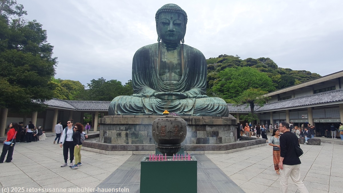 gemäss meiner karte müsste es von hier einen weg zurück auf den daibutsu hike trail geben, aber wir finden keinen solchen. wir müssen deshalb einen umweg durch den ort machen. mitten in einem wohnquartier finden wir dank dem navi einen steilen aufstieg zurück auf den wanderweg. wir folgen diesem und treffen kurz vor dessen ende auf eine schulklasse. der abstieg zur strasse hinunter verzögert sich etwas, weil die vielen kinder den weg blockieren. gegen 12:40 uhr erreichen wir den daibutsu - auch "great buddha of kamakura" genannt - und damit das ende des wanderweges. auch hier herrscht reges treiben.