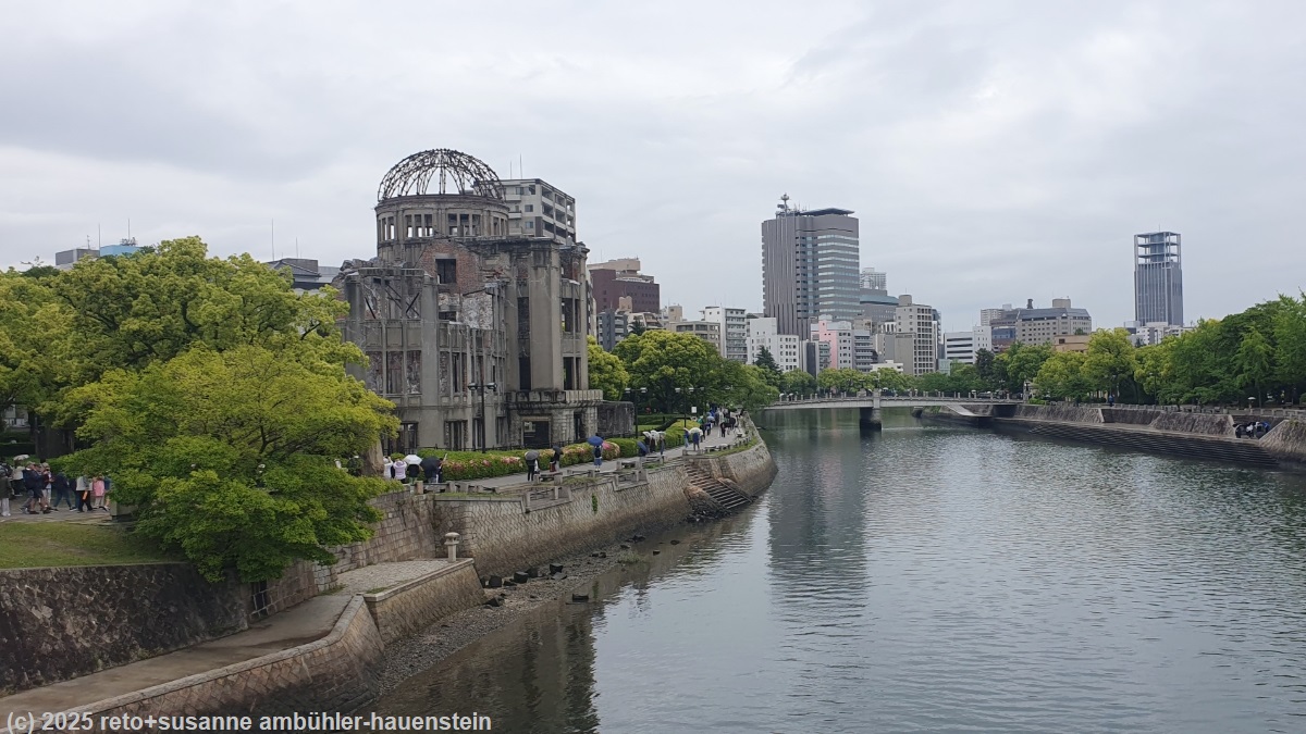 wir stehen um 8 uhr auf und geniessen das vorzügliche frühstücksbuffet, an welchem wir alles finden, was unser herz begehrt. um 09:30 uhr marschieren wir zum bahnhof um für die zugfahrt von übermorgen sitzplätze zu reservieren. anschliessend besuchen wir das hiroshima peace memorial museum, dabei kommen wir am atombomben-dom vorbei. im museum herrscht ein enormes gedränge, offensichtlich ist das interesse an den ereignissen von vor 80 jahren immer noch enorm. wenig überraschend präsentieren sich die japaner ausschliesslich in der opferrolle. nach knapp zwei stunden verlassen wir das beklemmende museum wieder und picknicken bei leichtem regen auf einer parkbank am motoyasugawa river. danach kehren wir zum hotel zurück, wo susanne eine waschmaschine nutzt, um unsere schmutzigen kleider zu waschen. kurz vor 17:45 uhr spazieren wir zu einem restaurant, welches uns heute nachmittag aufgefallen ist und geniessen ein traditionelles japanisches essen. auf dem rückweg zum hotel machen wir einen kleinen umweg und gönnen uns kaffee, tee und gebäck in der city bakery im bahnhof.