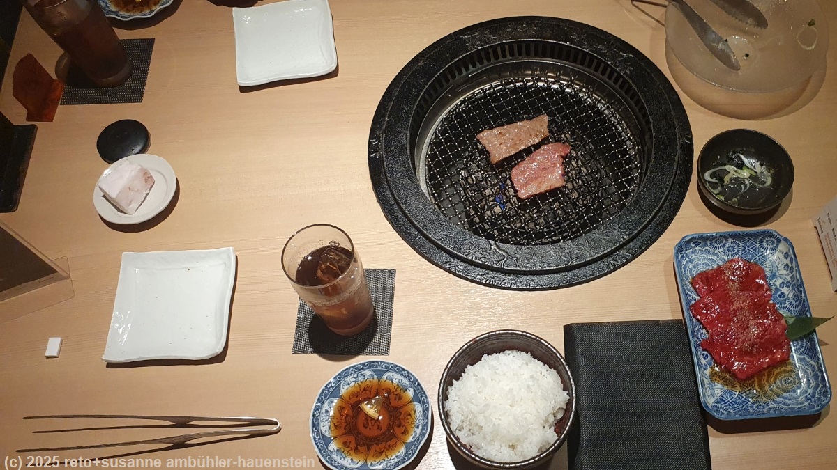 beim bahnhof kaufen wir das mittagessen für morgen ein. bei dieser gelegenheit finden wir auch ein "mont blanc" - so werden hier die vermicelles genannt. die dame hinter der theke versichert mir, dass es in diesen süssspeisen kein alkohol hat, also wage ich den versuch. zurück im hotel machen wir einen kaffee bzw. tee und ich geniesse mein vermicelles. danach starten wir eine maschine mit schmutziger wäsche. während diese läuft, duschen wir. draussen hat sich der regen eingelassen. hoffentlich stimmt die vorhersage, dass es morgen wieder trocken und nur noch bewölkt sein soll. kurz nach 17:30 uhr machen wir uns auf den weg zu den arkaden, bei denen wir heute auf dem rückweg ein interessantes restaurant gesehen haben. als wir dieses betreten, werden wir in einen separaten raum geführt. in diesem hat es einen tisch und vier stühle. in ersterem ist ein runder grill eingelassen, darin hat es glühende holzkohlen. die menukarte erhalten wir via QR code auf dem handy. es gibt viele fleischgerichte. wir wählen eines mit dünnen fleischscheiben, dazu reis und einen salat. letzterer wird als erstes serviert und schmeckt sehr gut. danach erhalten wir das rohe fleisch und je eine schüssel reis. wir braten die fleischstücke auf dem grill. sie schmecken sehr gut, auch wenn das fleisch nicht besonders zart ist. dazu haben wir tee bestellt. wir haben uns noch nicht daran gewöhnt, dass man bei kaffee und tee jeweils ausdrücklich sagen muss, wenn man das getränk heiss haben möchte und so gibt es eistee statt den erwarteten grüntee.