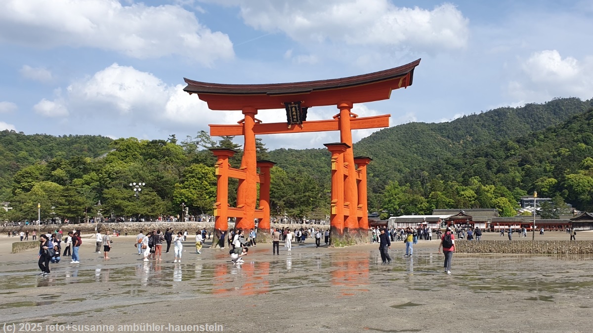 als der wecker um 8 uhr einschaltet, sind wir bereits wach. wir haben aber beide gut geschlafen. auch in diesem hotel ist es nachts äusserst ruhig. wir frühstücken und machen uns dann auf den weg zum bahnhof. das wetter ist trocken aber der himmel noch bewölkt. schon bald sehen wir jedoch erste blaue löcher in der wolkendecke. den 09:30 uhr zug sehen wir gerade noch wegfahren. glücklicherweise verkehrt diese linie aber im 15 minuten-takt, so brauchen wir uns nicht lange zu gedulden. anfangs ist der zug gut besetzt, aber je weiter wir uns von hiroshima entfernen, desto weniger leute hat es. in miyajima-guchi verlassen wir den zug und marschieren zur fähre. nun hat es plötzlich sehr viele leute. zu den zahlreichen touristen gesellen sich am samstag wohl noch etliche einheimische. auch die fähre zur insel miyajima verkehrt alle 15 minuten. zwar steht, dass inhaber eines JR-pass direkt zum eingang gehen dürfen, dort müssen wir uns aber doch noch an einer kasse anstellen, um die besuchersteuer von JPY 100 = CHF 0.60 pro person zu entrichten. die überfahrt zur insel verläuft ruhig. das wetter wird immer sonniger, allerdings bläst ein kräftiger wind. schon vom schiff aus haben wir das O-torii gate - auch great torii gate genannt - gesehen, eine der hauptattraktionen dieser insel. das tor steht bei flut im wasser, bei ebbe kann man trockenen fusses um das tor herum gehen.