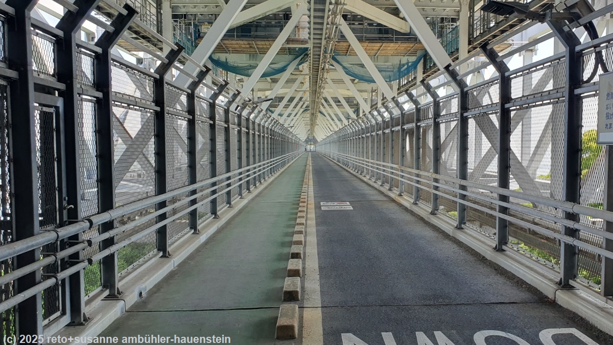 in habu machen wir einen kurzen toilettenstopp, dann nehmen wir den letzten abschnitt unserer dreitägigen radtour in angriff. wir haben uns für die route um das nördliche ende der insel innoshima entschieden. entsprechend folgen wir der westlichen küste nordwärts. dabei haben wir eine sehr schöne aussicht aufs wasser. die temperatur nimmt langsam zu, aber dank dem fahrtwind ist es sehr angenehm. nach 4.5 km unterqueren wir die hängebrücke ikuchi, über diese sind wir am ersten tag geradelt. nach weiteren knapp 2.5 km erreichen wir eine gabelung, bei der wir am ersten tag aus dem landesinneren an die küste gekommen sind. eigentlich hätten wir schon auf dem hinweg der küste folgen wollen, waren aber kurz nach der hängebrücke innoshima falsch abgebogen. nun haben wir doch noch die gelegenheit, der küstenstrasse zu folgen. als wir bereits wieder auf der selben route sind wie auf dem hinweg, erreichen wir den innoshima amenity park. dieser ist gut am riesigen, weissen dinosaurier zu erkennen, der direkt an der strasse steht. wir würden gerne etwas trinken und fahren deshalb zum angeschriebenen cafe. dieses ist aber geschlossen. so erfrischen wir uns halt an einem der schattigen tische aus susannes trinkflasche. die weiterfahrt beginnt mit dem aufstieg zur hängebrücke innoshima-ohashi hinauf. auch über diese brücke sind wir am ersten tag gefahren, aber natürlich in die umgekehrte richtung. nun befinden wir uns bereits wieder auf der insel mukaishima. auf dieser liegt unser heutiges tagesziel und gleichzeitig das ende der radtour. anfangs folgt der radweg der küste, dann geht es richtung onomichi mukaishima. in einem supermarkt kaufen wir fürs mittagessen ein, dann radeln wir zur fähre nach onomichi.