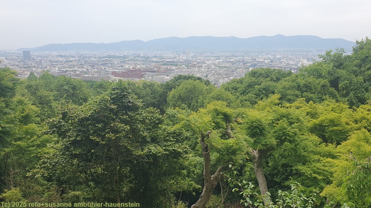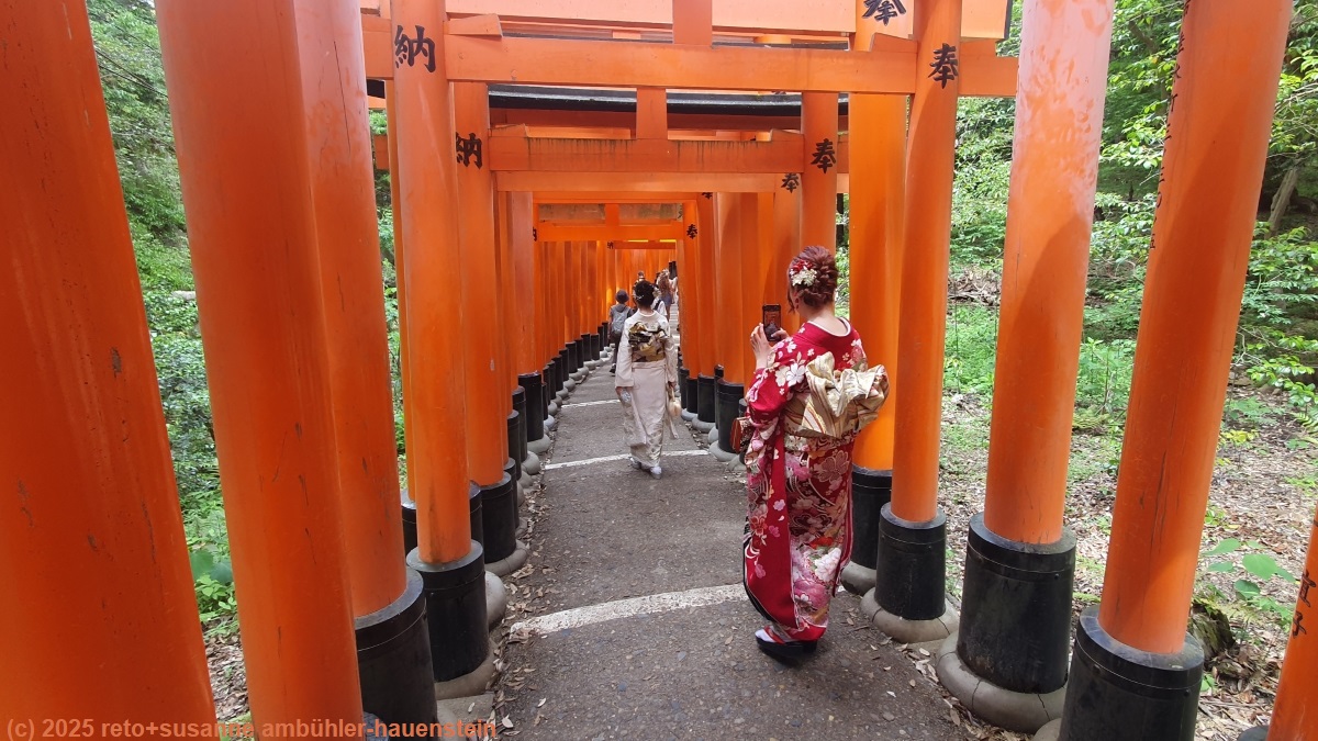 auch wenn der himmel nicht wolkenlos ist, so ist es doch unglaublich heiss, die temperatur liegt knapp unter 30°C und die luftfeuchtigkeit ist enorm hoch. wir erreichen das hotel total verschwitzt, ziehen daher leichtere kleider an und deponieren danach die drei rucksäcke. anschliessend marschieren wir zur metrostation gojo. unterwegs kaufen wir in einem supermarkt fürs mittagessen ein. im bahnhof steigen wir in einen regionalzug um und fahren mit diesem zum fushimi inari schrein. hier hat es sehr viele leute. wir bewundern die gebäude am eingang und setzen uns dann für das mittagessen auf einen stein an einem weg der etwas abseits der route liegt. ein mehrere kilometer langer weg führt durch eine endlose reihe von toren, die senbon torii. manchmal ist der weg eher flach, manchmal müssen wir steile treppen erklimmen. glücklicherweise liegt der weg in einem wald, so ist die temperatur sehr erträglich. am anfang des weges hat es enorm viele leute und jeder will entweder ein selfie oder ein foto von seiner begleitung machen. je weiter wir uns vom eingang entfernen, umso weniger leute hat es. so schaffen wir es irgendwann doch noch, einmal ein bild ohne menschen zu machen. der pfad führt bis auf den gipfel des 233 meter hohen mount inari hinauf. kurz vor dem höchsten punkt haben wir eine tolle aussicht über die stadt. vom eigentlichen gipfel aus sieht man allerdings gar nichts, denn dieser ist dicht bewaldet. wir setzen unsere rundwanderung fort, nehmen aber bei einer verzweigung schliesslich eine abkürzung zum haupttempel, bei dem sich der ausgang befindet. uns scheint, nun hat es noch mehr leute, welche die anlage besuchen möchten. bemerkenswert finde ich, dass bei diesem tempel kein eintritt verlangt wird.