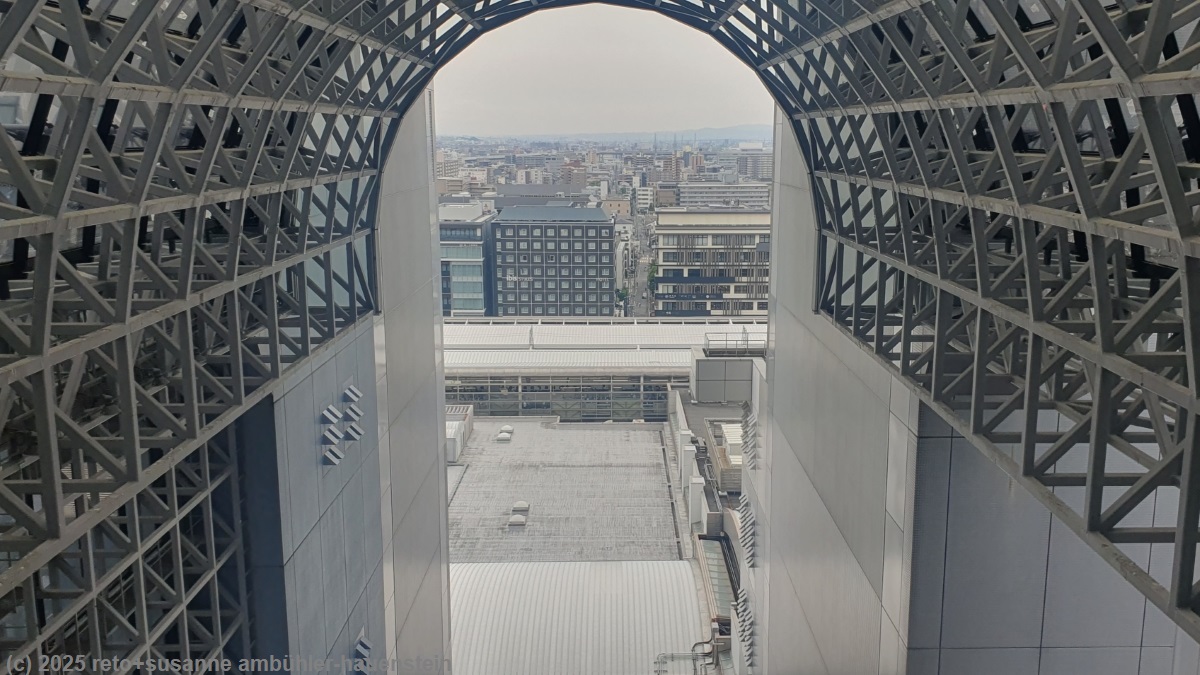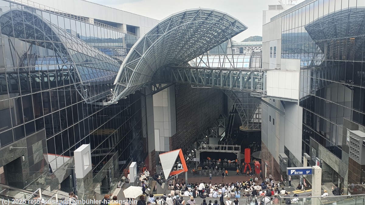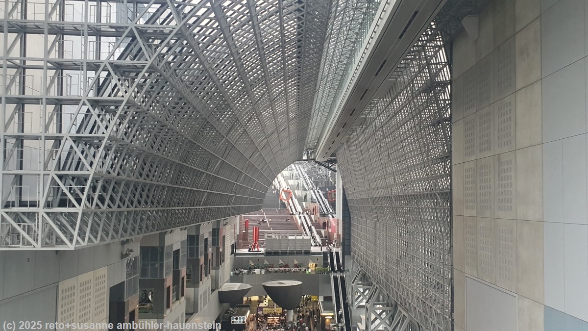 mit dem zug fahren wir zurück zur kyoto station. auf der suche nach einem kaffee kommen wir an einer riesigen treppe vorbei. an deren fuss spielt ein orchester auf einer bühne, die zuhörer sitzen auf der treppe. die akustik zwischen den hohen wänden ist fantastisch. wir setzen uns ebenfalls auf die treppe und hören eine weile zu. danach finden wir ein nettes cafe und geniessen einen köstlichen zvieri. allerdings müssen wir uns diesen erst mit etwas geduld verdienen, denn das lokal hat ein komisches reservationssystem. man muss sich registrieren und sollte per email benachrichtigt werden, wenn der tisch bereit ist. ich habe mich zwar registriert, eine email kommt aber nicht. der kellner macht sich einfach nach kurzem bemerkbar und meint, wir dürfen uns nun setzen. der bahnhof von kyoto ist ein modernes gebäude aus stahl und glas, dem wohl niemand mit einer kamera widerstehen kann. auch wir machen da und dort ein foto. man findet immer wieder neue blickwinkel mit spiegelungen oder anderen tollen optischen effekten. schon als wir 2005 einige tage in kyoto waren, erging es uns so, siehe reisebericht.