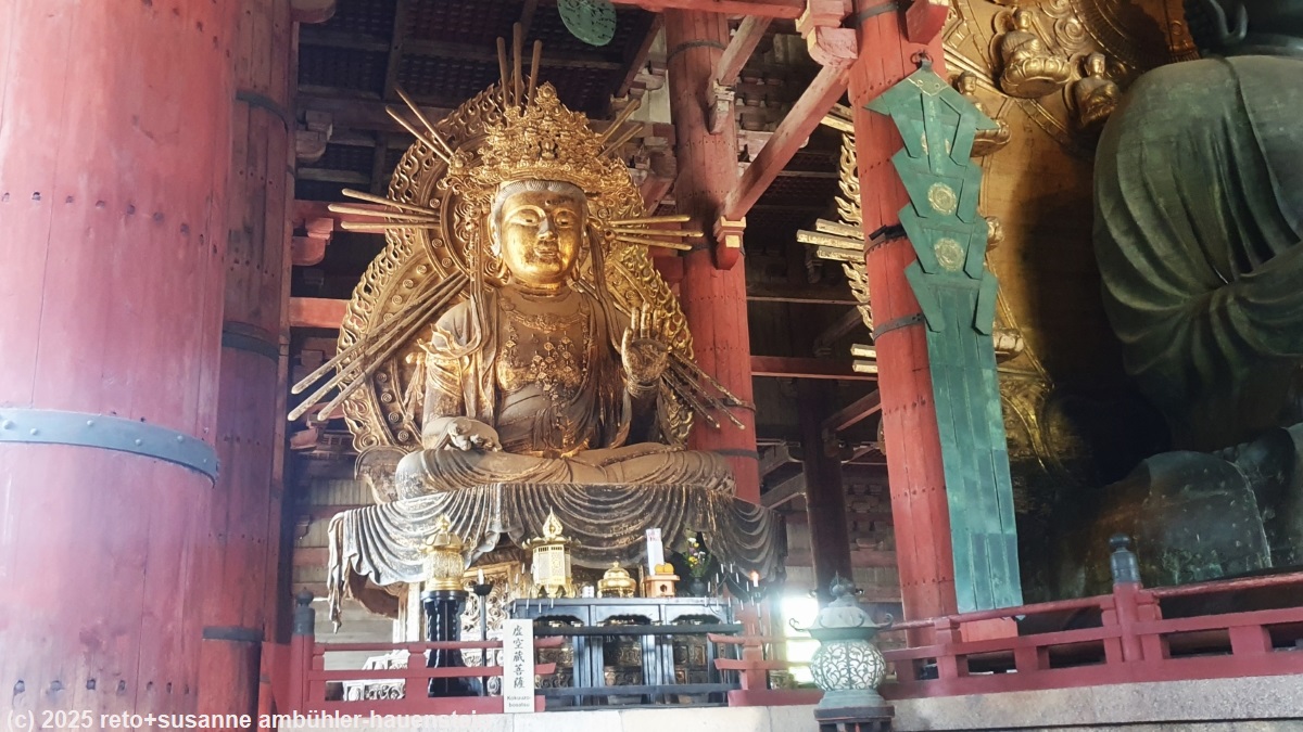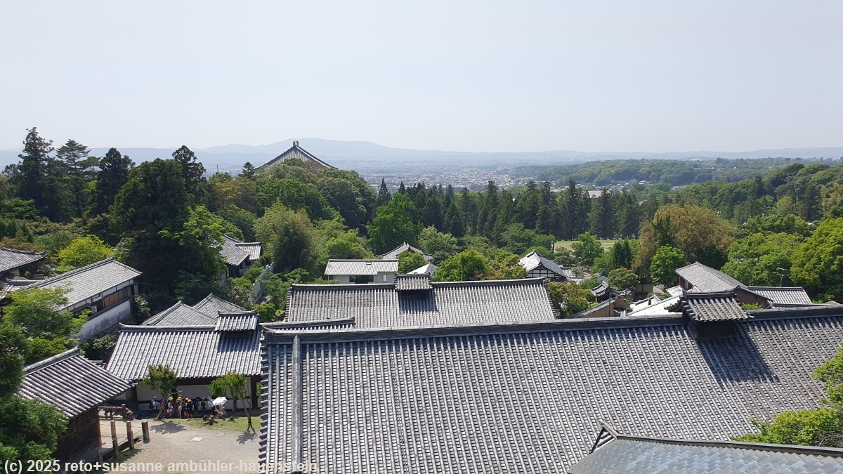 um 12:45 uhr sind wir beim eingang des todaiji tempel. hier befindet sich der daibutsu, der grosse buddha. manchmal habe ich den eindruck, die europäischen kirchenbauer und die japanischen tempelbauer leiden gelegentlich an grössenwahn. manche kirchen und manche tempel sehen für mich aus, als seien sie fünf mal zu gross gebaut worden. wir bewundern den grossen buddah in seinem tempel und setzen dann unsere wanderung fort. bei der nigatsudo hall picknicken wir auf einer treppe im schatten eines nebengebäudes. danach geniessen wir vom balkon der halle den blick auf die tempelanlage und die stadt.