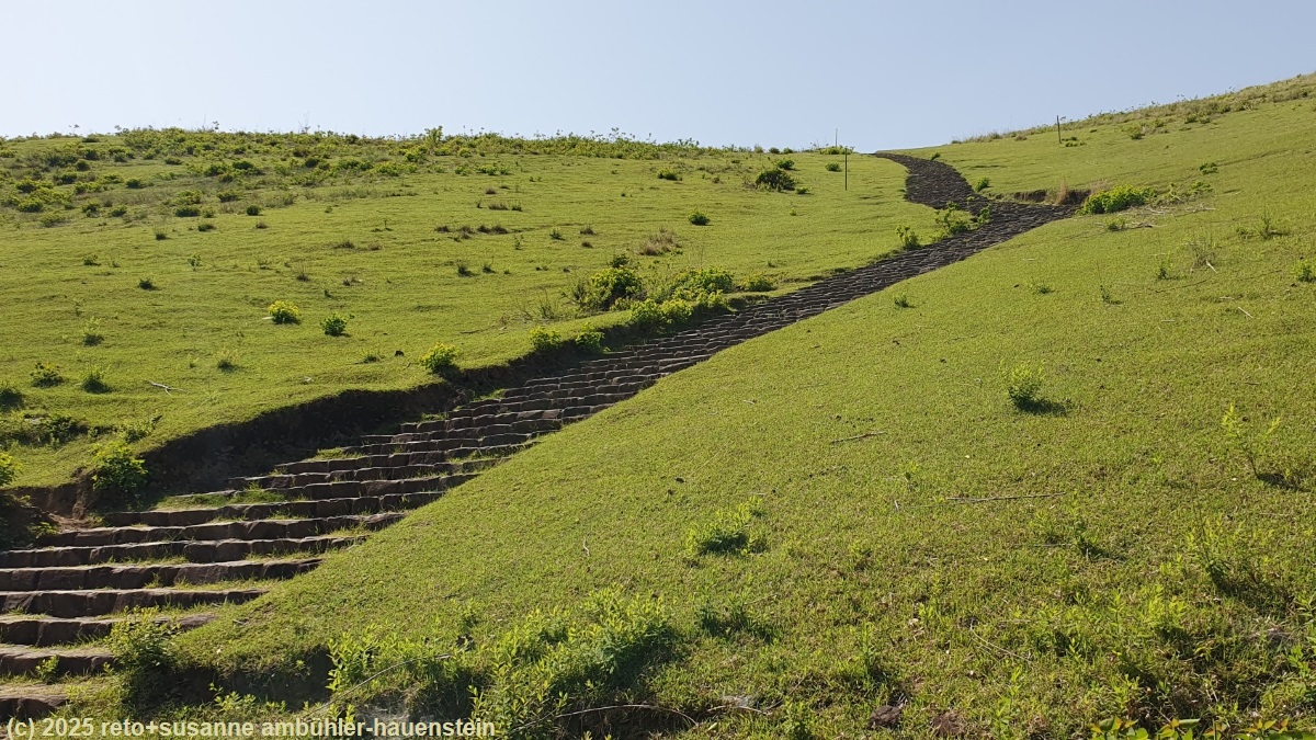 erst durch einen angenehm kühlen wald und dann über eine strasse ohne schatten geht es südwärts. wir erreichen den nara park. hier führt eine lange treppe auf einen hügel hinauf. wir wollen uns diesen kleinen umweg nicht entgehen lassen und erklimmen die steile treppe. diese folgt glücklicherweise dem waldrand und ist daher im schatten. auf kurzer distanz erklimmen wir 130 höhenmeter. vom aussichtspunkt knapp unter dem höchsten punkt haben wir eine fantastische rundsicht über die stadt. auch heute ist die fernsicht getrübt. wir sind uns nicht sicher, ob es wirklich so viel feuchtigkeit in der luft hat, oder ob das nicht eher smog ist. vom aussichtspunkt geht es wieder über eine lange treppe abwärts.