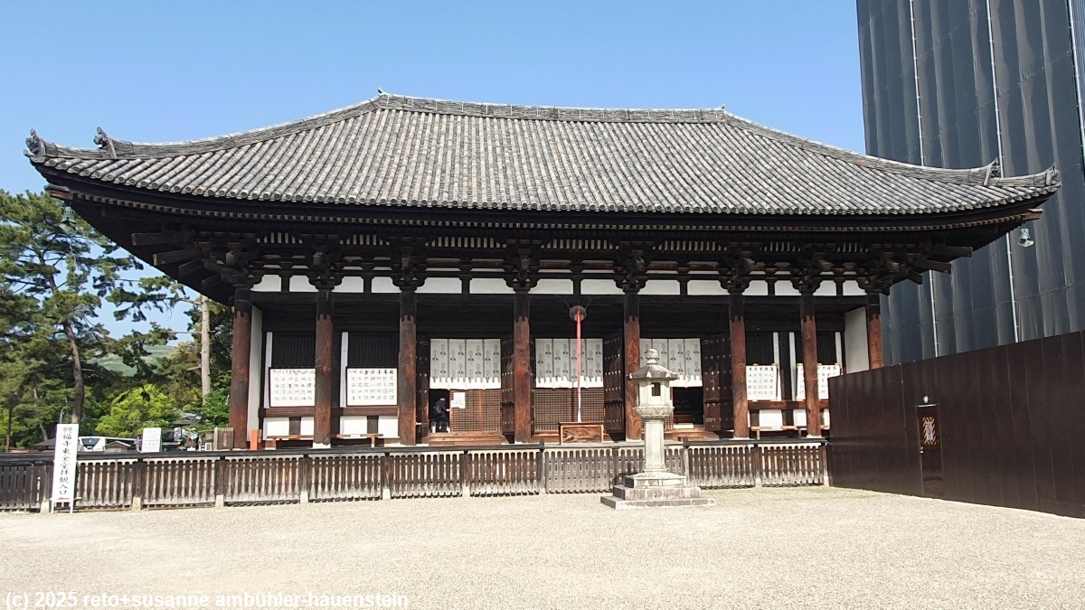 auf dem weg richtung stadt kommen wir am ninai tea room vorbei. dieses hat einen lauschigen garten, in diesem gönnen wir uns erfrischende getränke und ein eis. auf dem weg richtung stadtzentrum hat es wieder enorm viele leute und auch sehr viele rehe. die fünfstöckige pagode des kofukuji tempel ist leider eingegrüstet, die tempelgebäude sind aber ganz nett anzusehen.