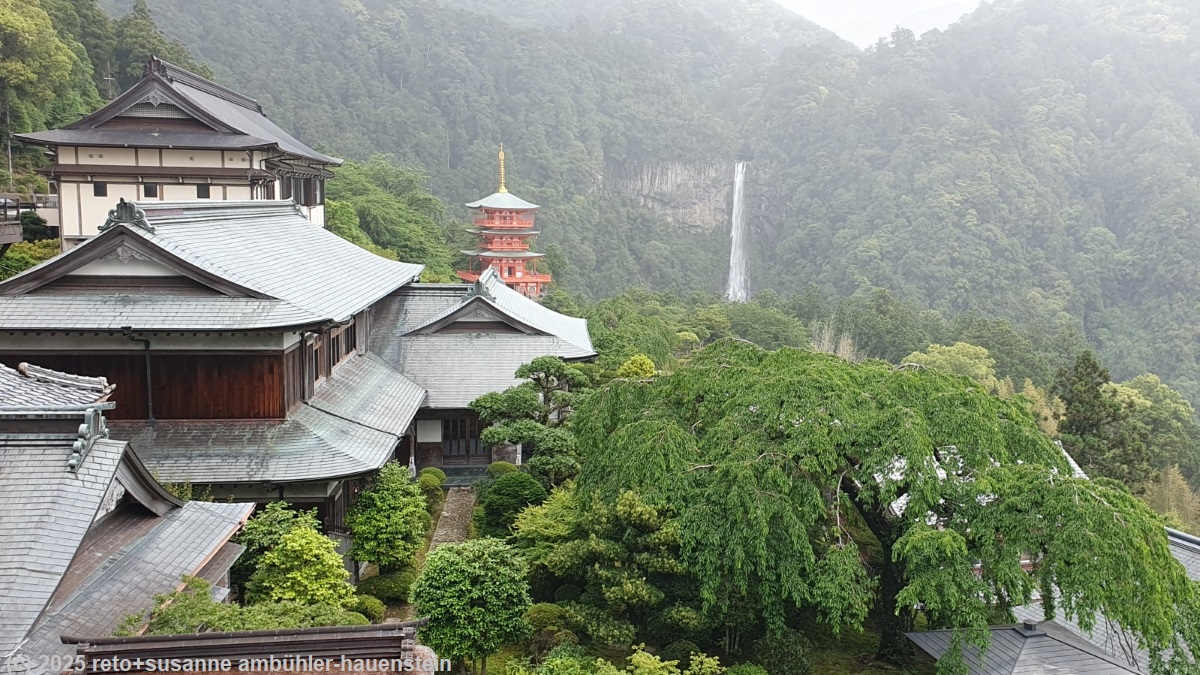 wir erreichen kii-katsuura pünktlich. leider hat sich das wetter zusehends verschlechtert, nun ist der himmel wieder grau, so wie gestern. wir verstauen unsere rucksäcke in einem schliessfach im bahnhof. der bus nach nachi-no-taki-mae ist sehr voll. glücklicherweise waren wir unter den ersten fahrgästen die eingestiegen sind, so haben wir sitzplätze. die fahrt über die kurvenreiche strasse macht es den passagieren, die stehen müssen, nicht einfach. bei daimonzaka steigen die meisten aus. wir fahren bis zur vorletzten bushaltestelle, etwas unterhalb der pagode des seigantoji, einer dreistöckigen pagode, wegen der wir hierher gekommen sind. eine steile treppe führt zu den tempeln und der pagode hinauf. letztere leuchtet trotz des trüben wetters in wunderschönem orange und der goldene spitz sieht aus wie frisch gereinigt. mit dem nachi wasserfall im hintergrund sieht das toll aus. wir machen auch noch bilder vom takiju-an und vom seiganto-ji tempel, dann begeben wir uns zur bushaltestelle nachisan.