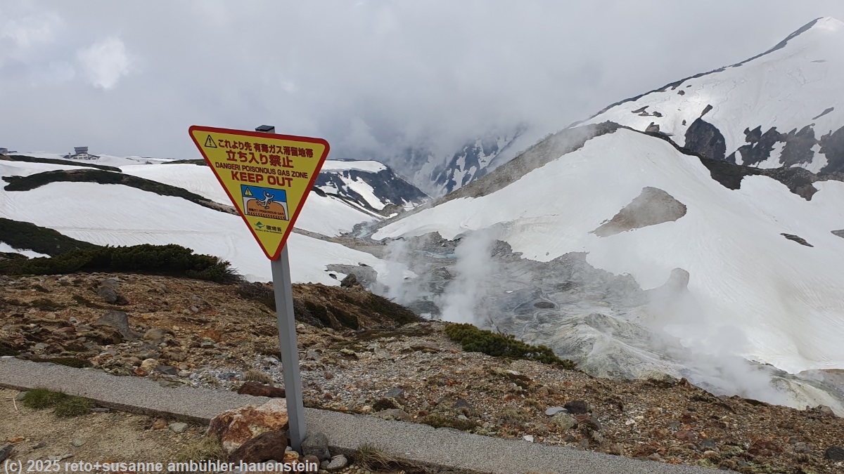die standseilbahn ist zwar gut besetzt, aber nicht ganz voll. der bähnler am eingang meint zwar, wir hätten die 9-uhr-bahn verpasst, lässt uns aber einsteigen. die fahrt zur bergstation bijodaira dauert 10 minuten. die ganze strecke bis auf die letzten paar meter vor der bergstation verläuft in einem tunnel. in bijodaira steigen wir in den tateyama highland bus um. dieser bringt uns in 50 minuten nach murodo, dem mit 2450 m.ü.m. höchsten punkt der alpine route. die fahrt über die schmale und kurvenreiche strasse ist fantastisch. für privatwagen ist die strasse gesperrt, es sind nur busse unterwegs. auf etwa 1500 m.ü.m erreichen wir die ersten schneefelder. manche bäume sehen etwas mitgenommen aus vom vielen schnee. wir fahren durch einen wunderschönen wald, der sich mit zunehmender höhe laufend verändert. besonders fallen mir die japanischen birken auf, die deutlich grösser sind, als die birken auf dem schwedischen fjäll. kurz vor ankunft in murodo fahren wir zwischen bis zu 15 m hohen schneemauern hindurch, das ist sehr beeindruckend.
