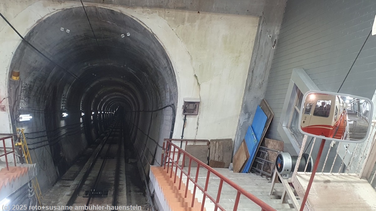 nun ist es zeit für uns, den rückweg anzutreten. wir marschieren zurück über den damm zur talstation der standseilbahn und fahren mit dieser nach kurobedaira hinauf. anschliessend nehmen wir die luftseilbahn nach daikanbo und den elektrischen bus nach murodo. hier haben wir knapp zeit für einen kaffee, danach geht es mit dem tateyama highland bus wieder nach bijodaira hinunter. noch einmal geniessen wir die fantastische aussicht auf der äusserst abwechslungsreichen fahrt.