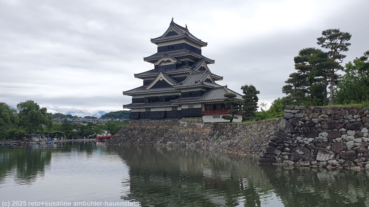 unser handy weckt uns um 07:30 uhr. obwohl das gebäude sehr hellhörig ist, war es beide nächte sehr ruhig und wir haben wunderbar geschlafen. wir frühstücken auch heute in der gemeinschaftsküche. die benutzung ist angenehm, alle gäste sind sehr rücksichtsvoll. nach dem frühstück packen wir unsere rucksäcke und machen uns gegen 09:30 uhr auf den weg richtung matsumoto. die fahrt über die strasse 84 bis zu den beiden tunnel im verlauf der strasse 158 verläuft äusserst entspannt, es sind kaum andere fahrzeuge unterwegs. das ändert auf der strasse 158 schlagartig. ein superlangsam fahrer schleicht über die kurvenreiche strasse und rollt äusserst zögerlich durch die vielen tunnel. als wir uns matsumoto nähern rollt der verkehr vorübergehend ein bisschen zügiger. aber in der stadt herrscht stehender kolonnenverkehr. es ist eine unendliche geduldsprobe, bis wir endlich das schloss erreichen. der parkplatz beim schloss ist voll, doch es dauert nur einige minuten, bis ein feld frei wird für uns. der himmel ist auch heute grau und verhangen. unterwegs fielen einige regentropfen, aber in matsumoto ist es trocken. wir spazieren durch den schlosspark, verzichten aber auf den eintritt ins schloss.
